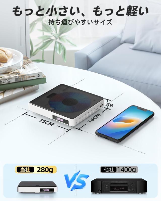 CDプレーヤーまたはDVDプレーヤーとして利用可能なこのミニDVDプレーヤーは、本体重わずか280g、横幅15cm、高さ3cm、奥行き14cmという小型なサイズで、どこへでも持ち運びが容易です。