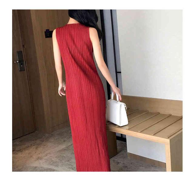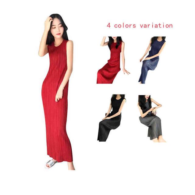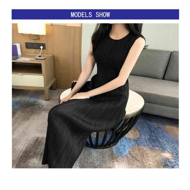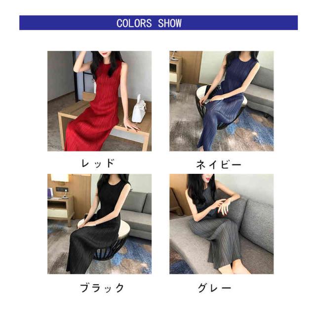 ワンピース レディース 丸襟 夏用 タンクトップ インナーワンピース プリーツワンピース ノースリーブ ストレートワンピース ミディアム丈 着痩せ ロングワンピース 無地 シンプル カジュアル お洒落 フェミニン 送料無料