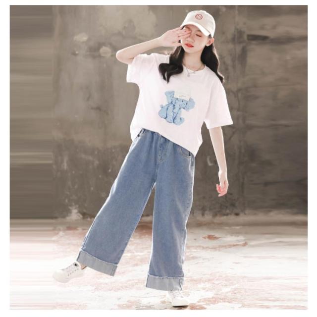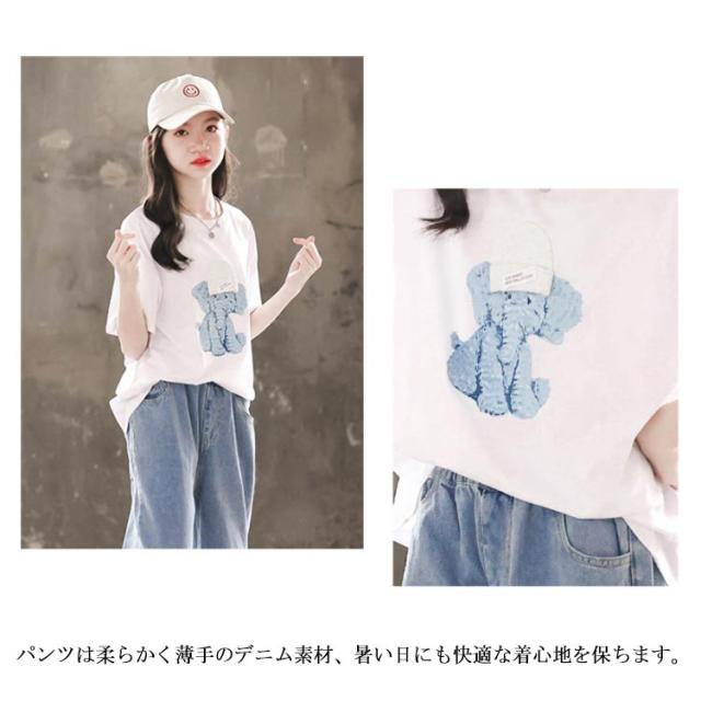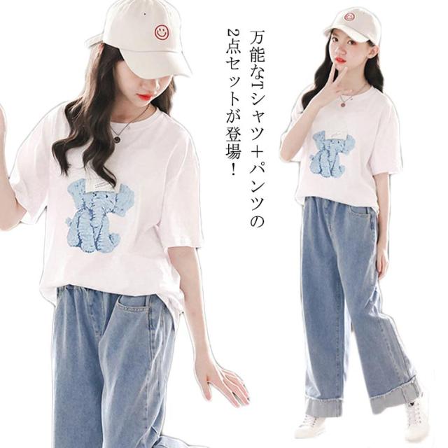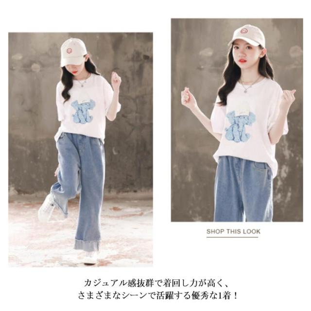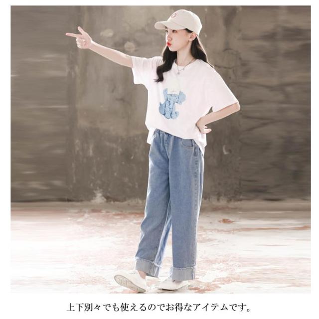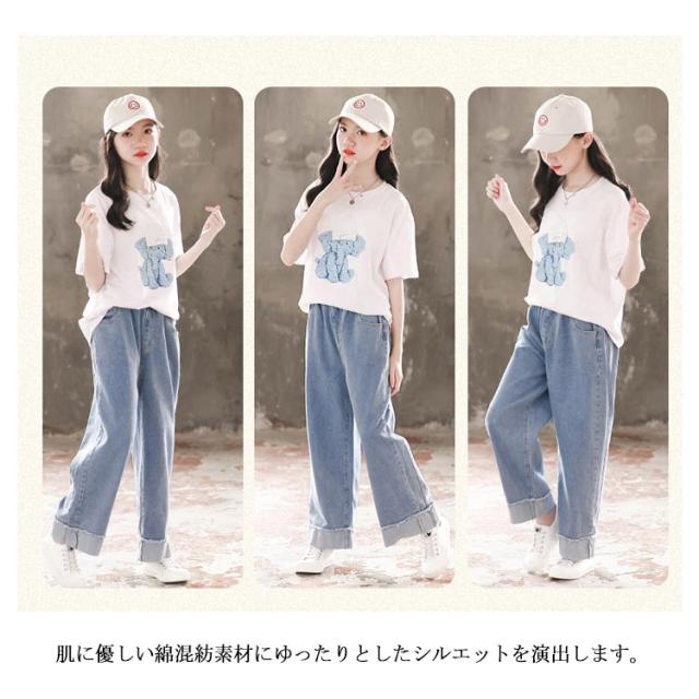 【送料無料】セットアップ キッズ ワイドパンツ 半袖 韓国子供服 子供服 tシャツ 春 夏 上下セット カジュアル デニムパンツ ジュニア 女の子 女児 薄手 綿 快適 涼しい シンプル 通学 お出かけ プレゼント ギフト 120cm-170cm