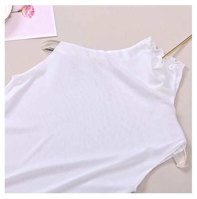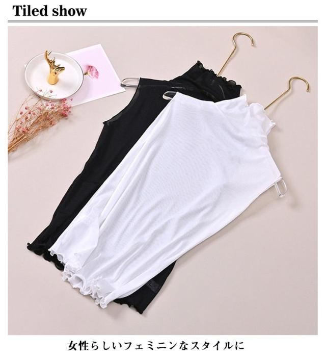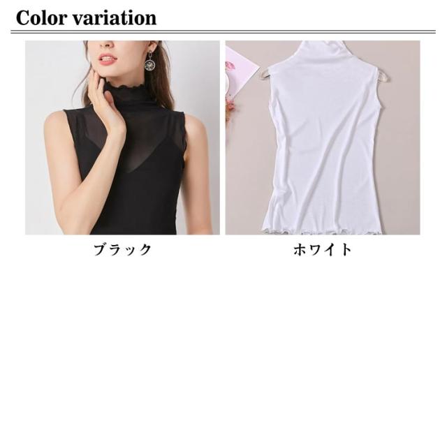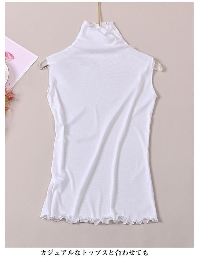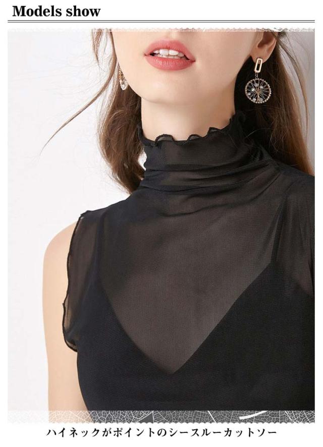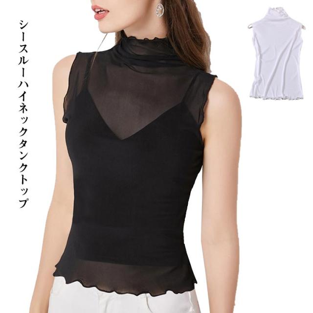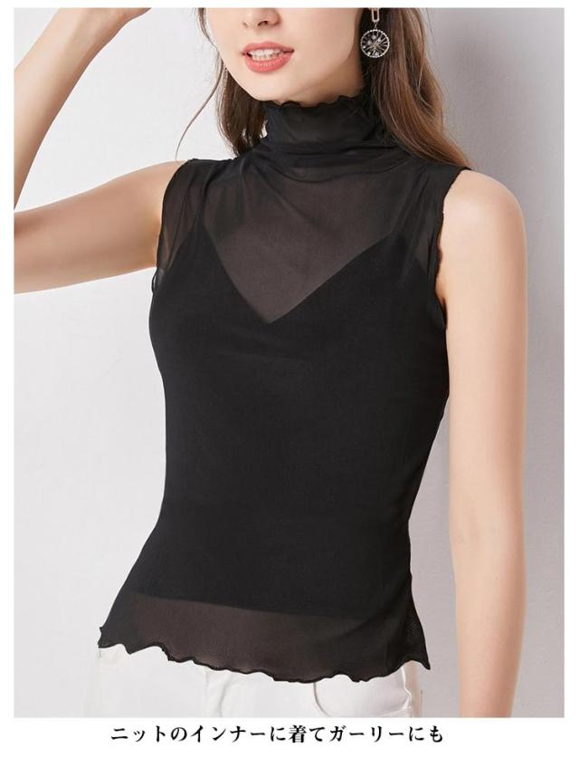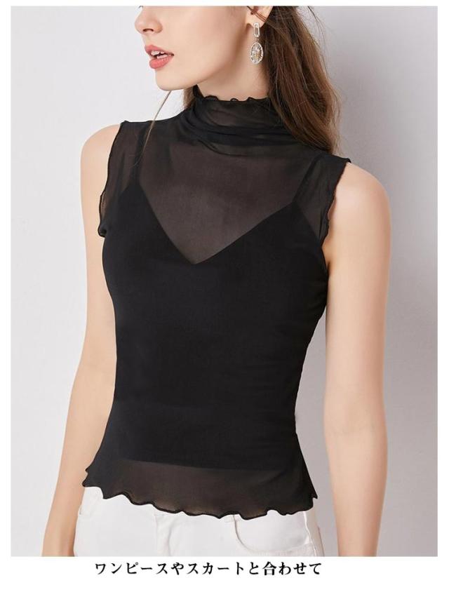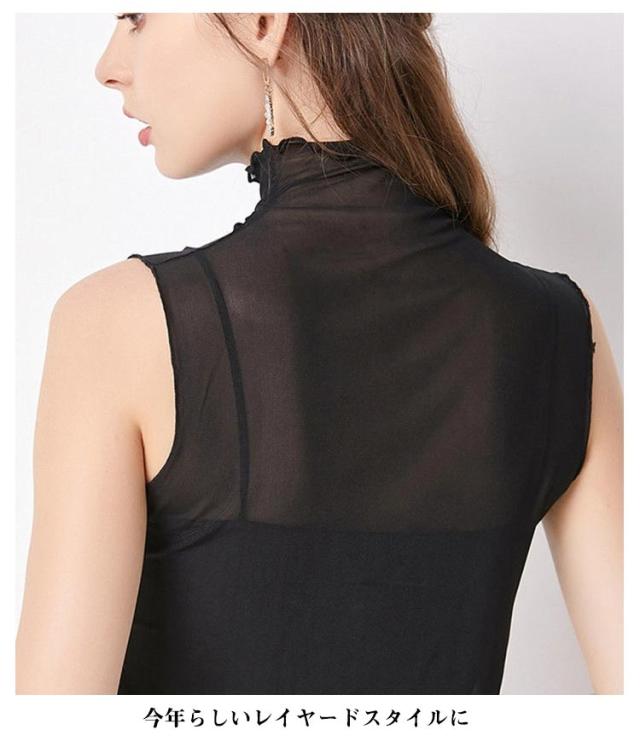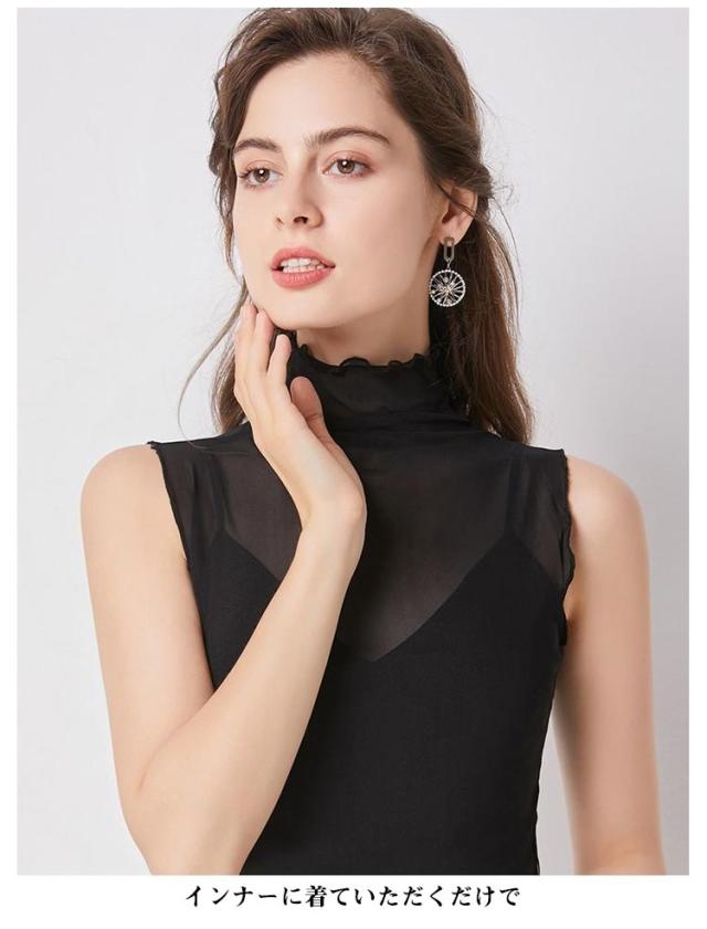 シースルー シアー トップス タンクトップ ハイネック ノースリーブ インナー 薄手 Tシャツ レディース 長袖 春夏 秋 おしゃれ 透け 重ね着 レイヤード コーデ 黒 無地 メッシュ風 ママ 普段着 デイリー OL 通勤 オフィス フリルネック 送料無料