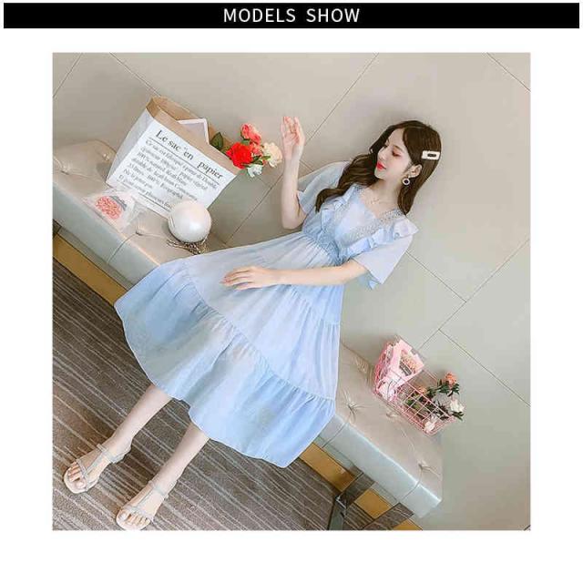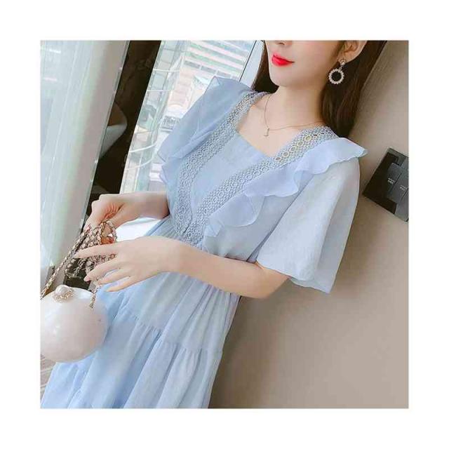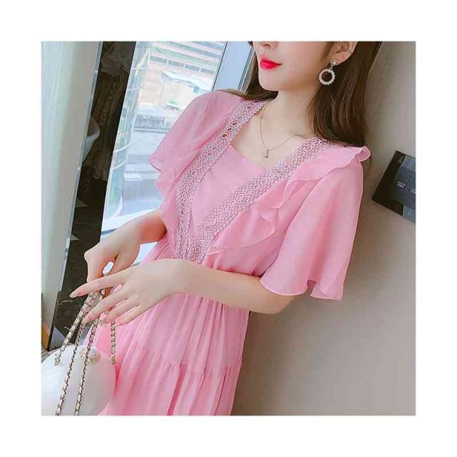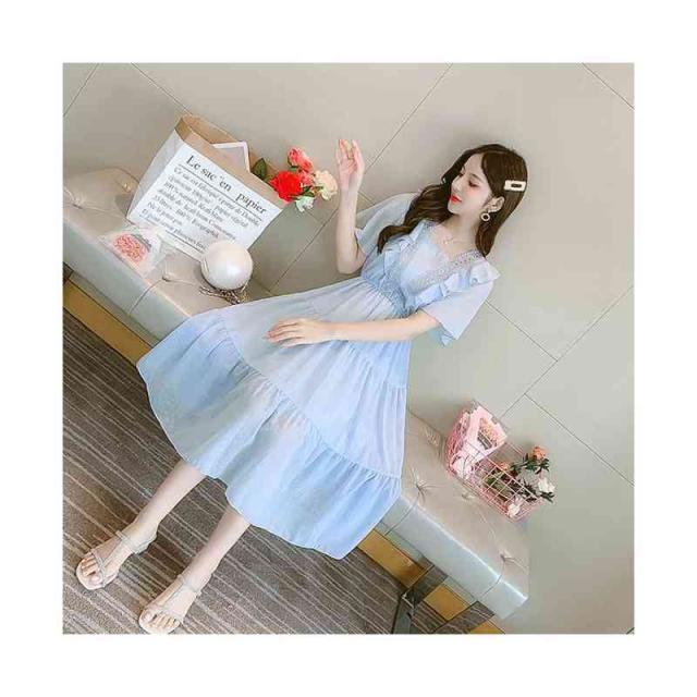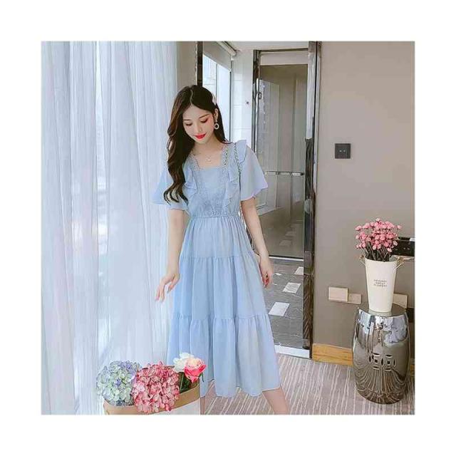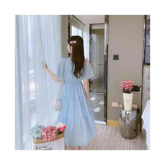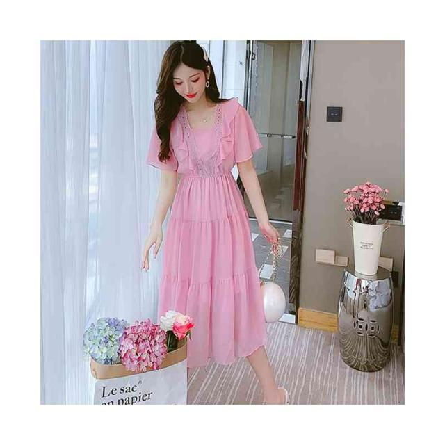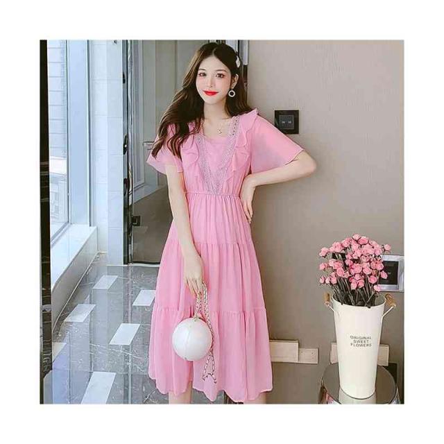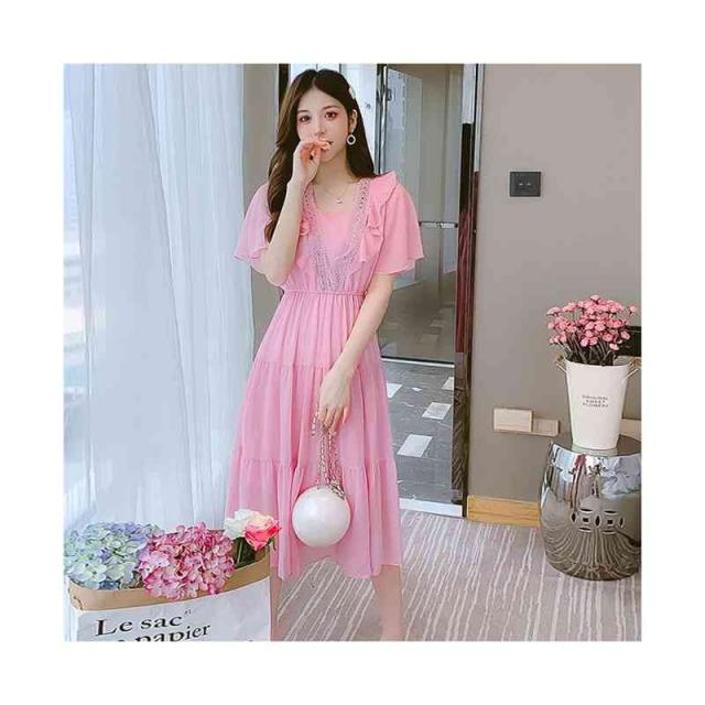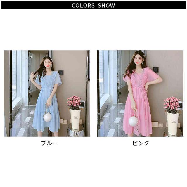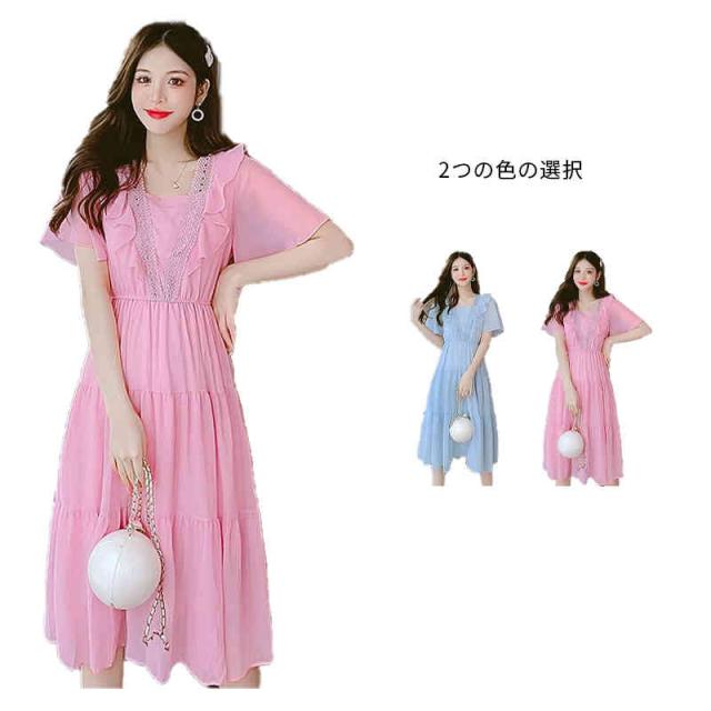 シフォンワンピース レディース 夏用 ウエストゴム ロングワンピース フリルワンピース ミディアム丈 半袖 切り替え シフォン フリル Aライン かわいい 無地 シンプル カジュアル おしゃれ 送料無料