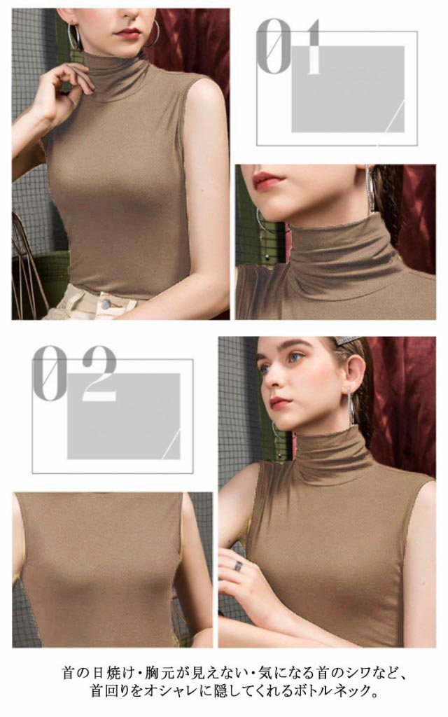 | 大人の女性でも着やすいナチュラルカラー5色。エレガントなコーディネートが楽しめるハイネックノースリーブ。 モダール素材で着心地が抜群。 首の日焼け・胸元が見えない・気になる首のシワなど、首回りをオシャレに隠してくれるボトルネック。 伸縮性が良く素材で肌触りも◎ 秋冬にはインナーとしても活躍してくれます。紫外線カット効果は春夏が目安となっております。 | |