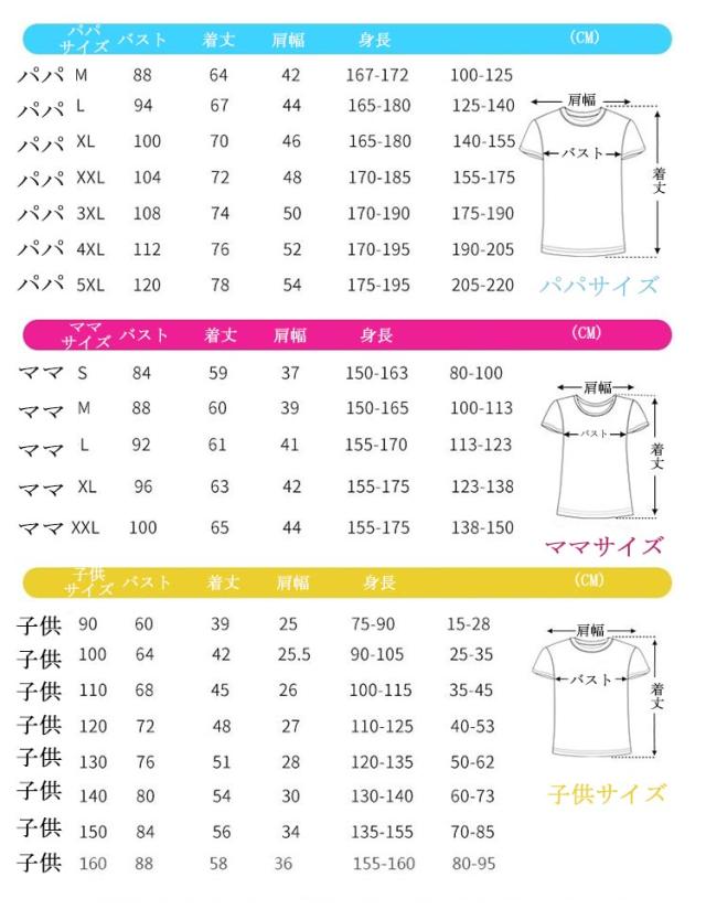 | サイズ | 子供90cm 子供100cm 子供110cm 子供120cm 子供130cm 子供140cm 子供150cm 子供160cm ママS ママM ママL ママXL ママ2XL パパM パパL パパXL パパ2XL パパ3XL パパ4XL パパ5XL |