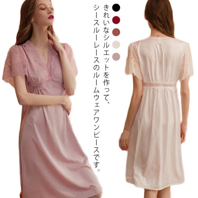 シースルーレーススリーブ サテンタッチ パジャマ ランジェリー 下着 セクシー ルームウェア 部屋着 レディース 春 夏 ワンピース 寝間着 可愛い M L XL 送料無料