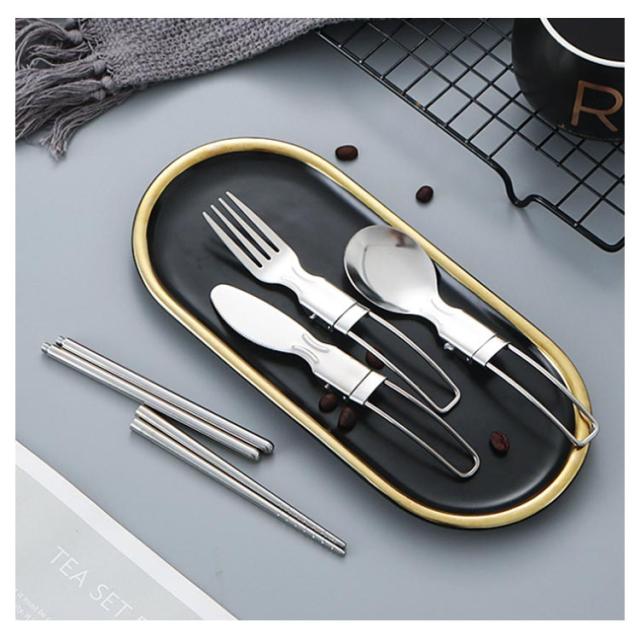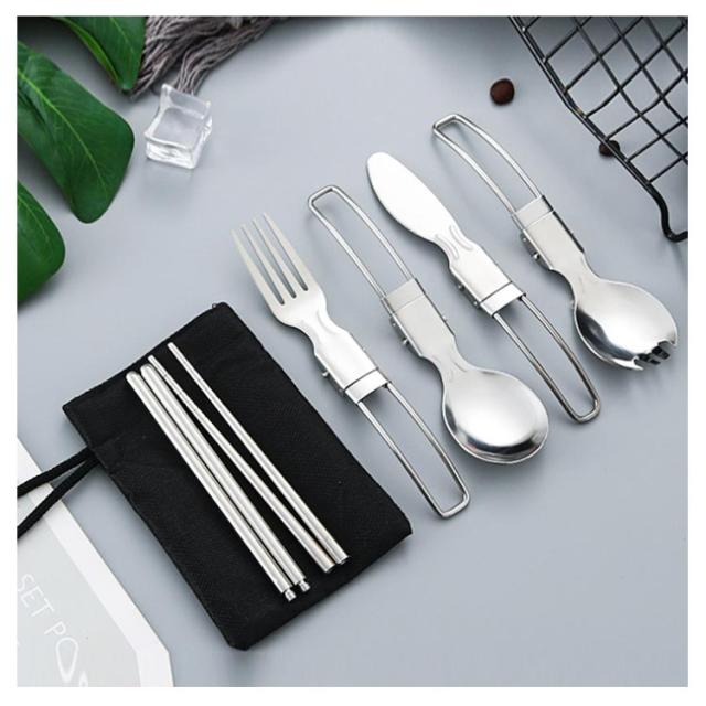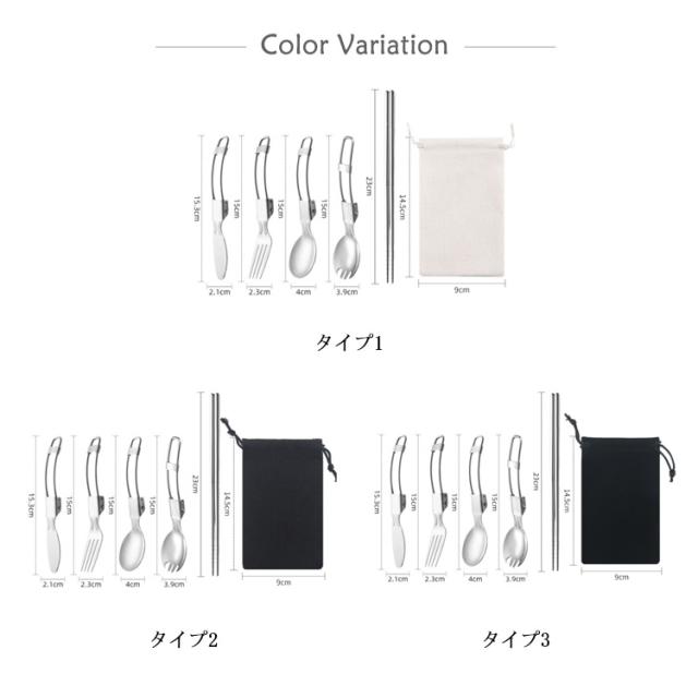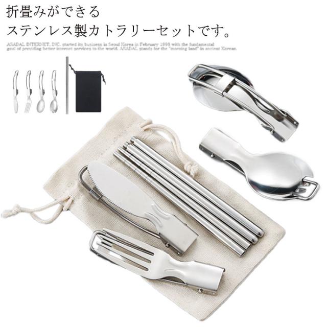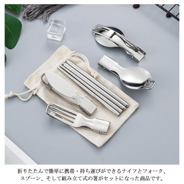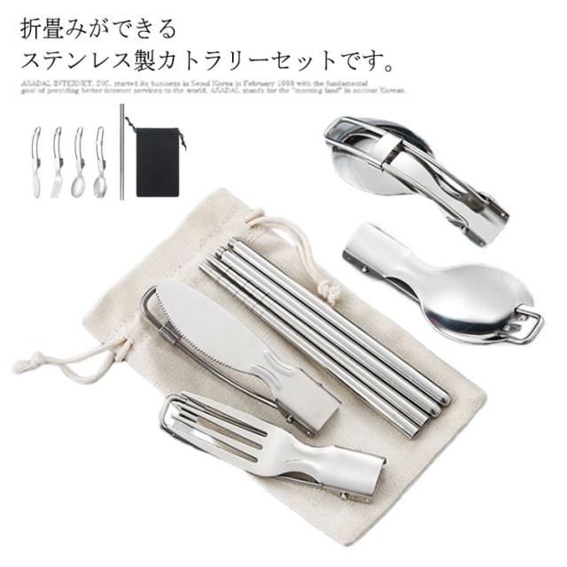 送料無料 折りたたみ式 ステンレス カトラリーセット 5点セット カトラリー フォーク スプーン ナイフ 箸 スプーンフォーク 収納袋 ステンレス製 金属製 軽量 携帯 ソロキャンプ用 食器 バーベキュー 釣り