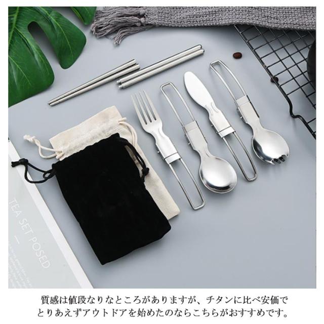 | 折畳みができるステンレス製カトラリーセットです。 折りたたんで簡単に携帯・持ち運びができるナイフとフォーク、スプーン、そして組み立て式の箸がセットになった商品です。 質感は値段なりなところがありますが、チタンに比べ安価でとりあえずアウトドアを始めたのならこちらがおすすめです。 | |