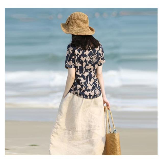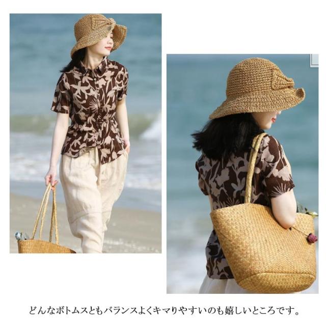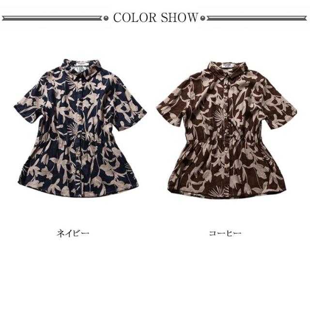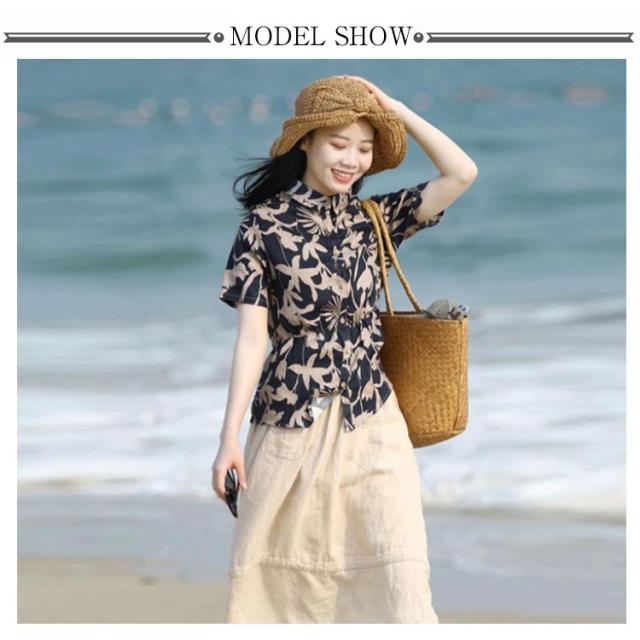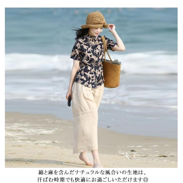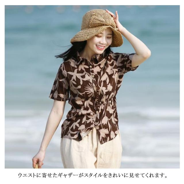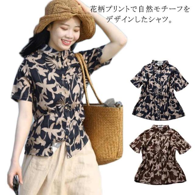 リネンシャツ レディース 麻 リネン シャツ 綿麻 リネン混 麻混 半袖 トップス ブラウス 花柄 ウエストギャザー 涼しい 軽い 通気性 大きいサイズ 春 夏 ナチュラル きれいめ カジュアル 通勤 オフィス 送料無料
