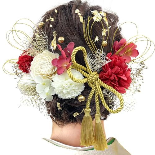 JZOON 髪飾り 成人式 髪飾り 9色 ドライフラワー 造花飾り 水引 紐 ヘアーアクセサリー 和玉 かすみ草 金箔 和服 着物 振袖 袴