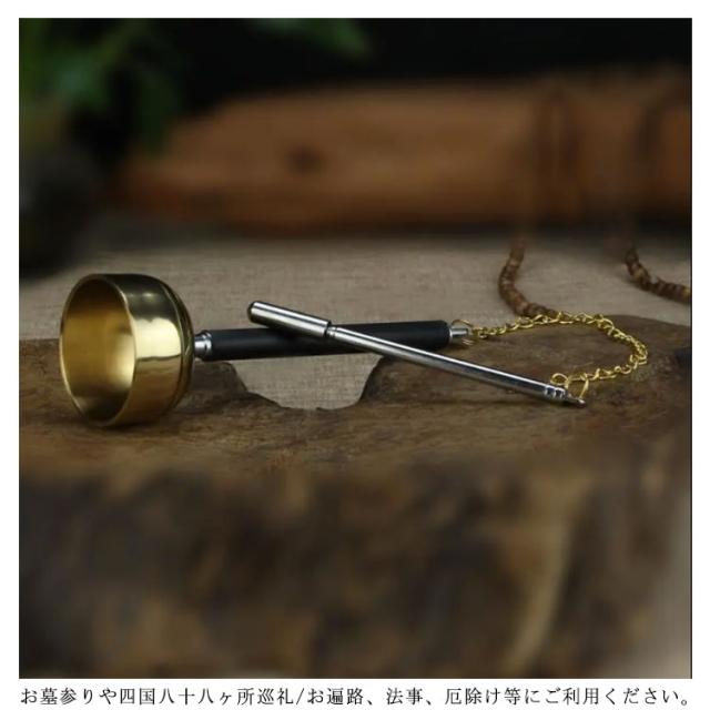 | 持ち運びに便利な収納式のおりん・りん棒・専用収納袋x1のセットです。 りん棒と印金(お輪)はつながっているので、落としたり無くしてしまう心配もございません。 巡拝や外での法要など、立ったままお使いになるのに便利です。 コンパクトですが余韻が続く澄んだ音色が特徴です。 お墓参りや四国八十八ヶ所巡礼/お遍路、法事、厄除け等にご利用ください。 | |