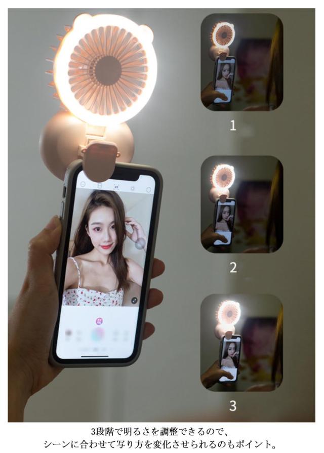 | ライト付き!!スマホに付ける扇風機 自撮りにお役立ちのLEDライト付き! 3段階で明るさを調整できるので、シーンに合わせて写り方を変化させられるのもポイント。 風量3段階で快適に涼む♪風量は弱・中・強の3段階のモードを搭載。 卓上扇風機としても使える!オフィスでも使いやすく、デスクワークのお供としても活躍します。 付属のネックストラップをつけて持ち歩きもラクラクです。 付属のUSBケーブルでの充電が可能で繰り返し使えます。 | |
