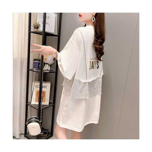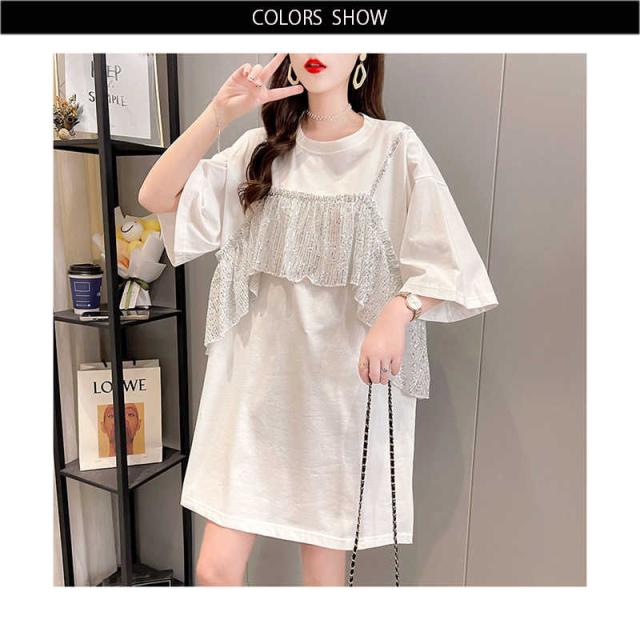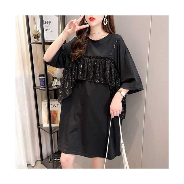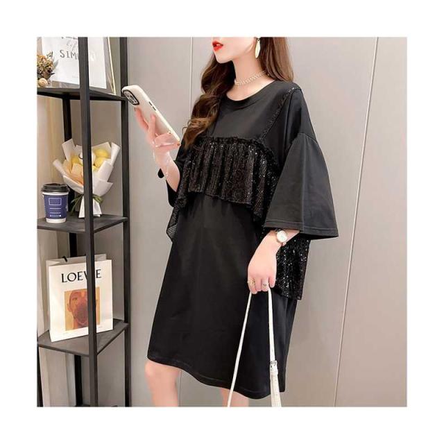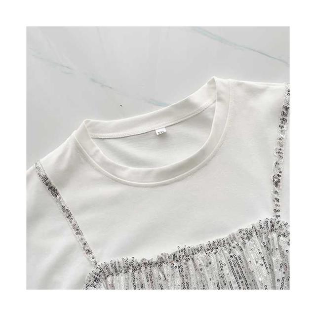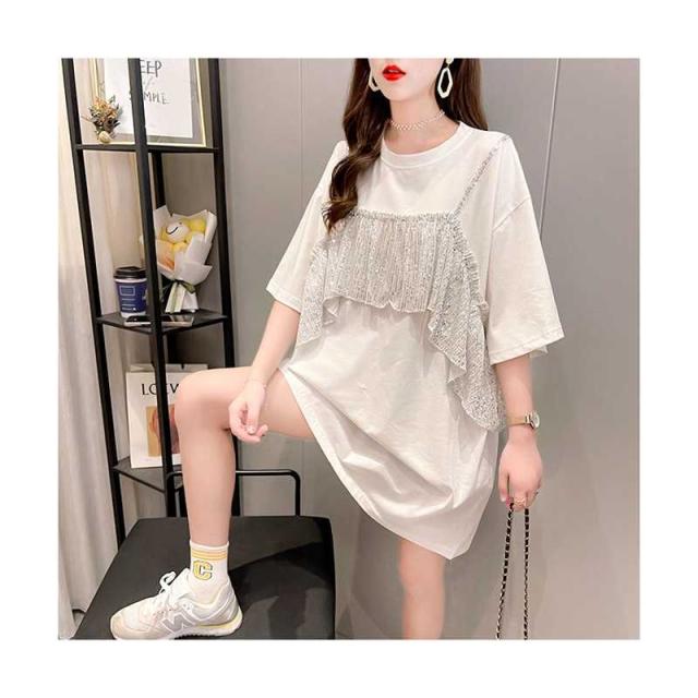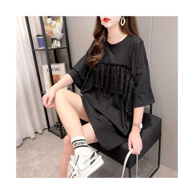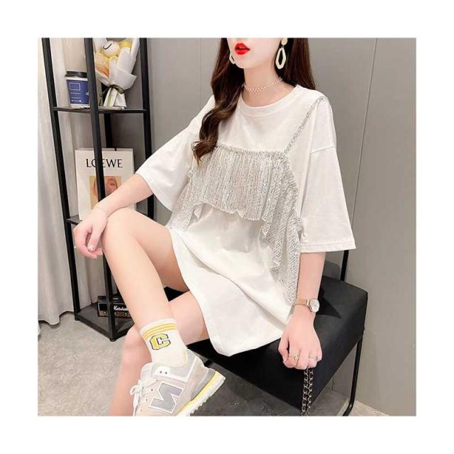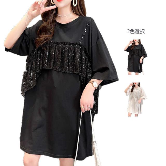 レディース ブラウス 春夏 シャツブラウス おしゃれブラウス フリル ミディアム丈 切り替え 丸襟 トップス 半袖 ゆったり コットン ブラウス ロングシャツ キラキラ 無地 シンプル カジュアル おしゃれ ダンス衣装 送料無料