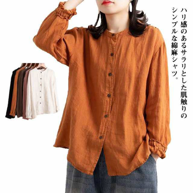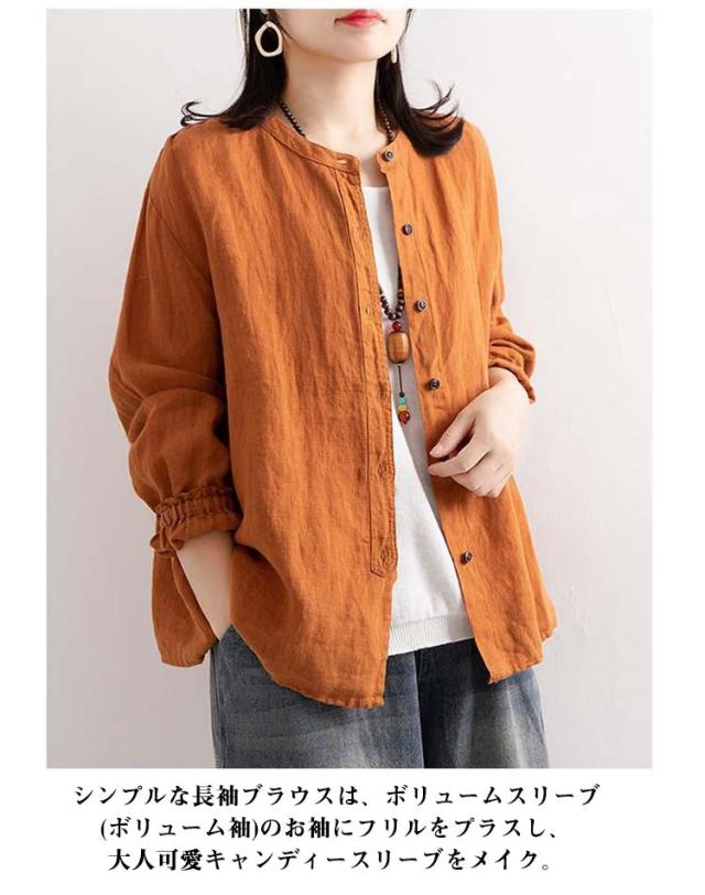 シャツ レディース ブラウス 無地 綿麻 シンプル ボリュームスリーブ キャンディースリーブ リボン リボン袖 長袖 ノーカラー 襟なし シャツチュニック