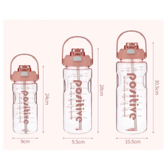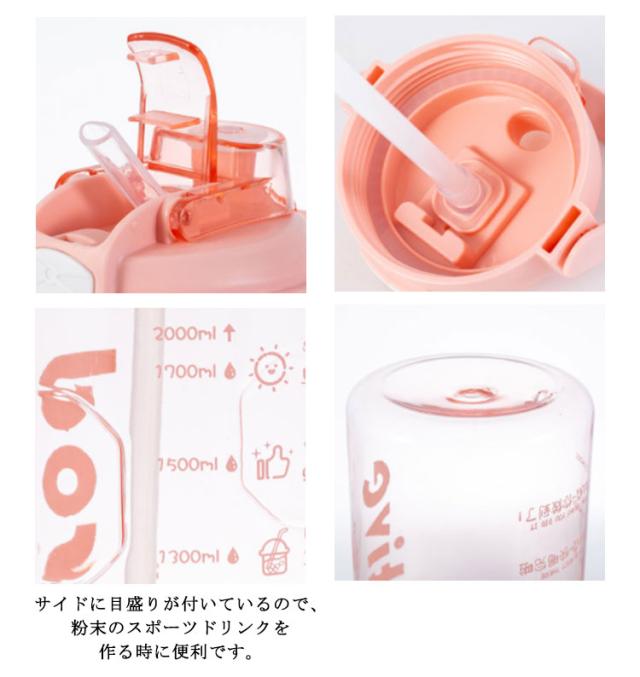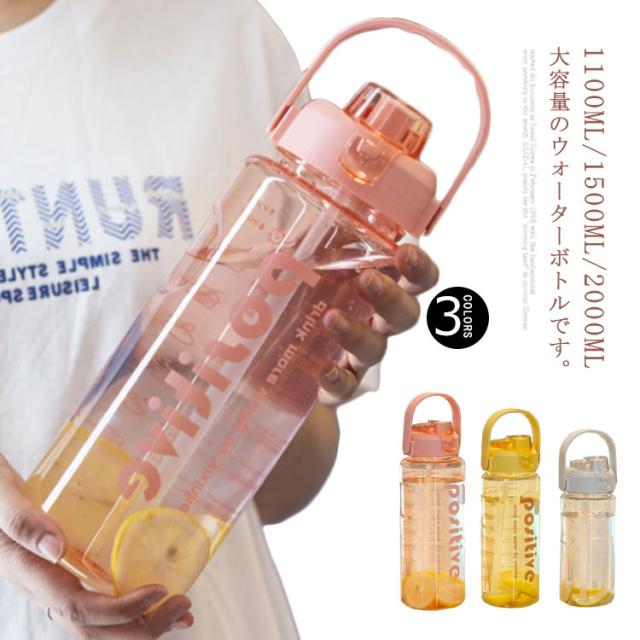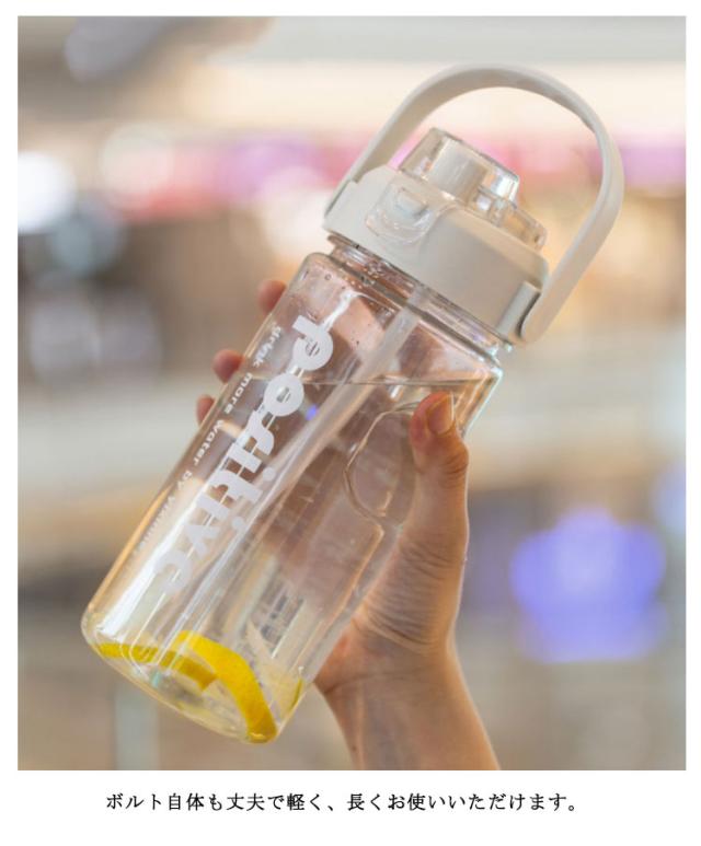 | 1100ml/1500ml/2000ml大容量のウォーターボトルです。 常温で水分補給をするアスリートやヨガなど、スポーツシーンで大活躍します。 持ち手がついており持ち運びも便利です。 サイドに目盛りが付いているので、粉末のスポーツドリンクを作る時に便利です。 口が広いので、ボトルの掃除や氷や果物の追加が簡単です。 ボルト自体も丈夫で軽く、長くお使いいただけます。 | |