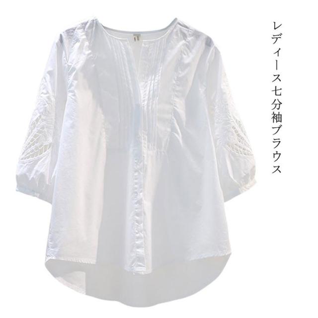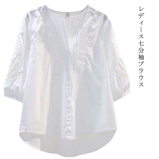 ブラウス レディース Vネック クルーネック トップス ブラウス 七分袖ブラウス 前開き 夏 薄手 ゆったり 体型カバー 着痩せ 花刺繍 透かし彫り コットン 可愛い 大人カジュアル 通勤 夏物 夏服 送料無料 韓国ファション