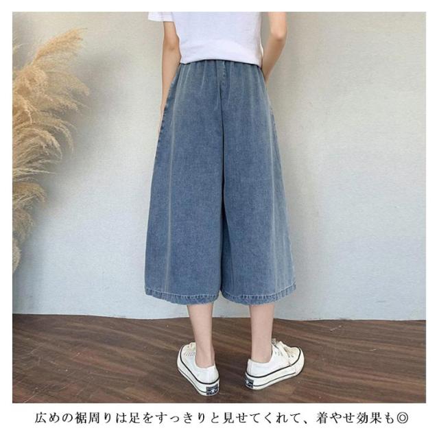 【送料無料】デニムパンツ ワイド デニムワイドパンツ ゆったり 7分丈 リボン 薄手 ボトムス 体型カバー ゴムウエスト 通勤 通学 ハーフパンツ カジュアル 大人 可愛い 20代 30代 40代 50代 無地 シンプル