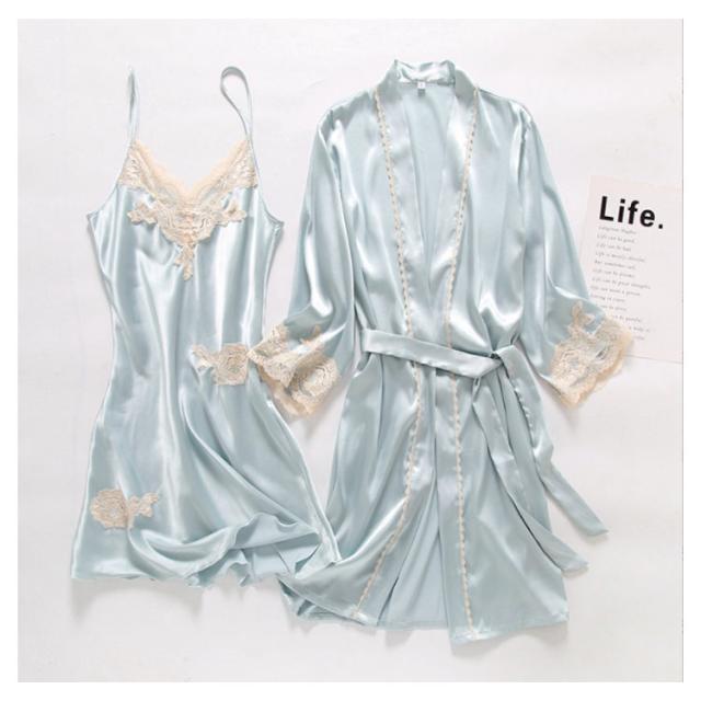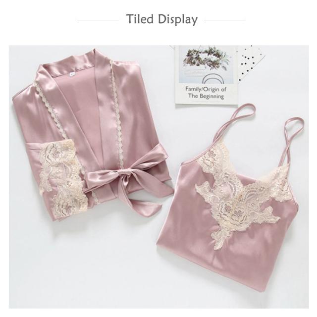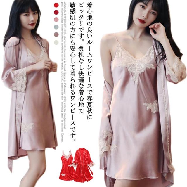 送料無料 ルームウェア キャミソール ガウン 夏 サテン レース 高級感 柔らかい 上品 かわいい パジャマ レディース 3点セット グロスガウンセットアップ ガウン&キャミソール&ショートパンツ&ポーチ ルームウエア