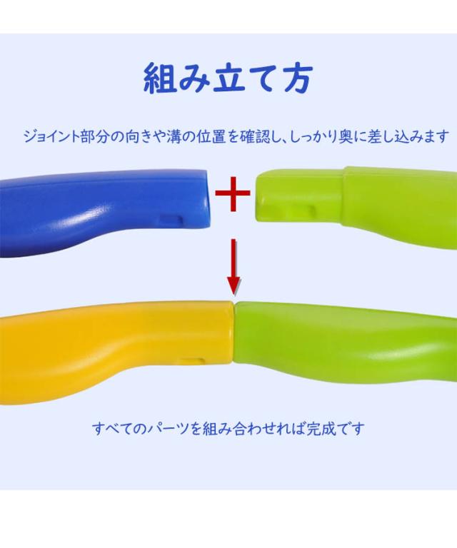 | 組み立て簡単フラフープで、おうちで手軽にエクササイズ!「こども用フラフープ」が新登場。 パイプ状になったジョイントパーツを連結させれば、カラフルなフラフープの出来上がり! 使わない時はパーツを外してコンパクトに片付けられます。 凸凹した波型のデザインで、小さいお子様でも握りやすく、簡単に遊べる仕様となっています。 初心者でも回しやすいので、コツを掴めばたくさん運動できちゃいます。 お子さま用のスポーツトイとしてはもちろん、ママのダイエット用まで、年代や性別、体型を問わずに幅広く使えるのが嬉しい! 組み立て方:ジョイント部分の向きや溝の位置を確認し、しっかり奥に差し込みます。すべてのパーツを組み合わせれば完成です。 | |