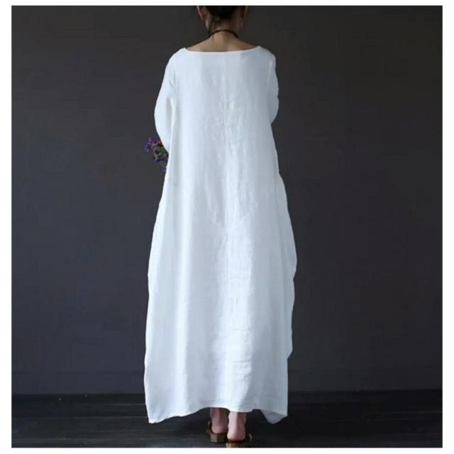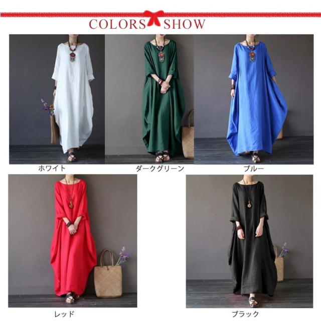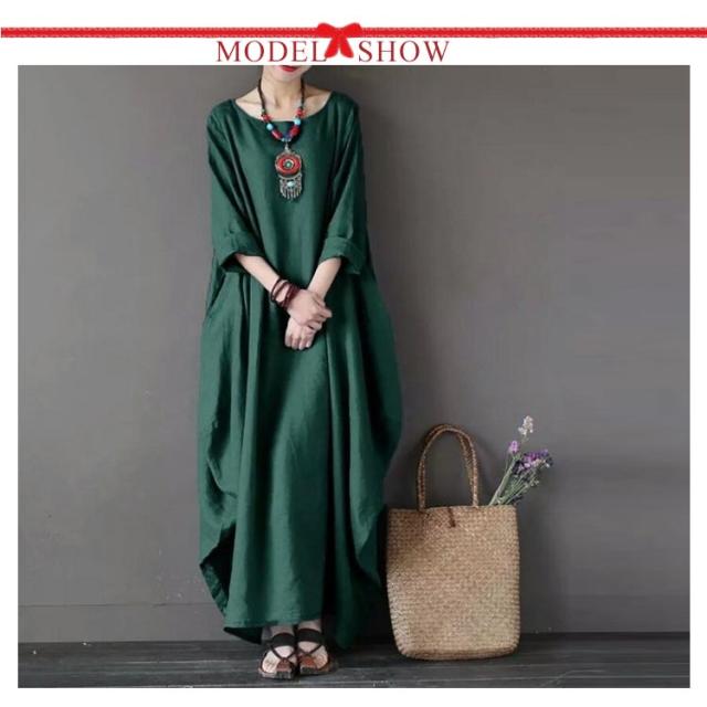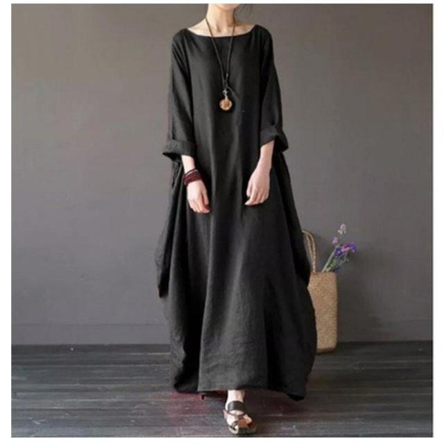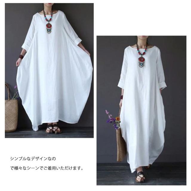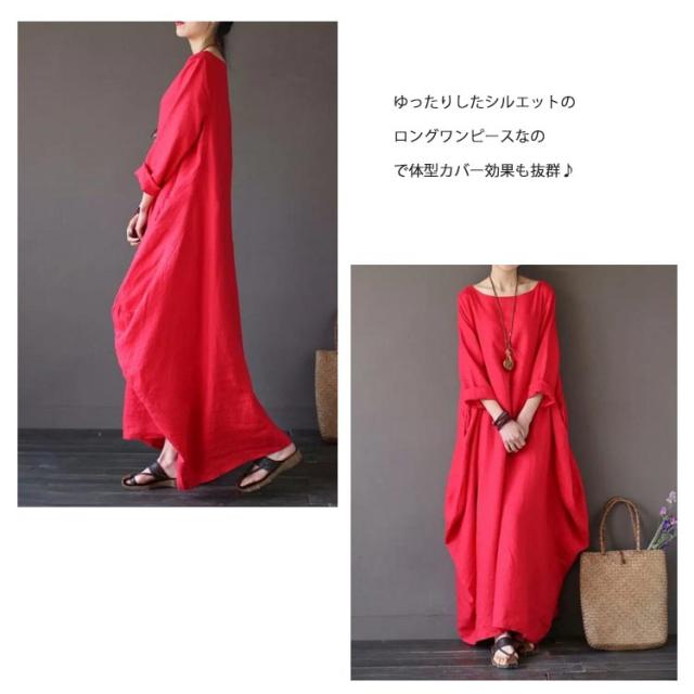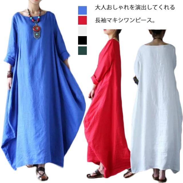 マキシワンピ ワンピース リネン調 クルーネック 無地 長袖 Aライン ロングワンピ マキシ丈 ワンピ ゆったり 体型カバー レディース 大人 ロングワンピ 長袖ワンピ 20代 30代 40代 OL ママ 母