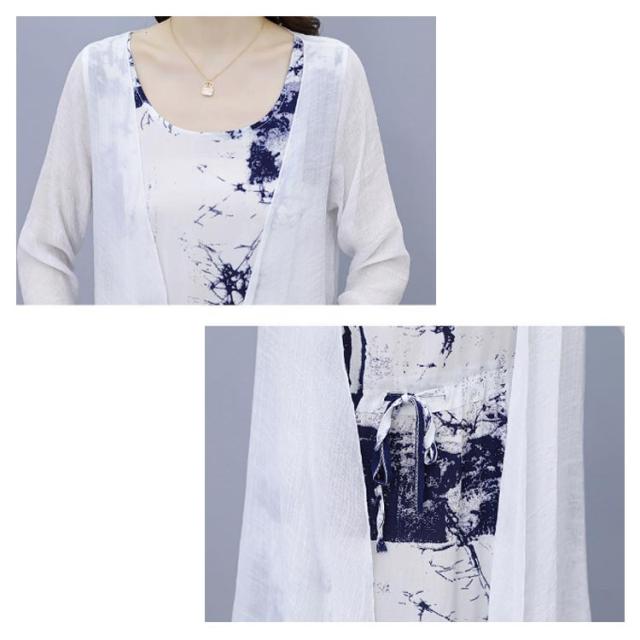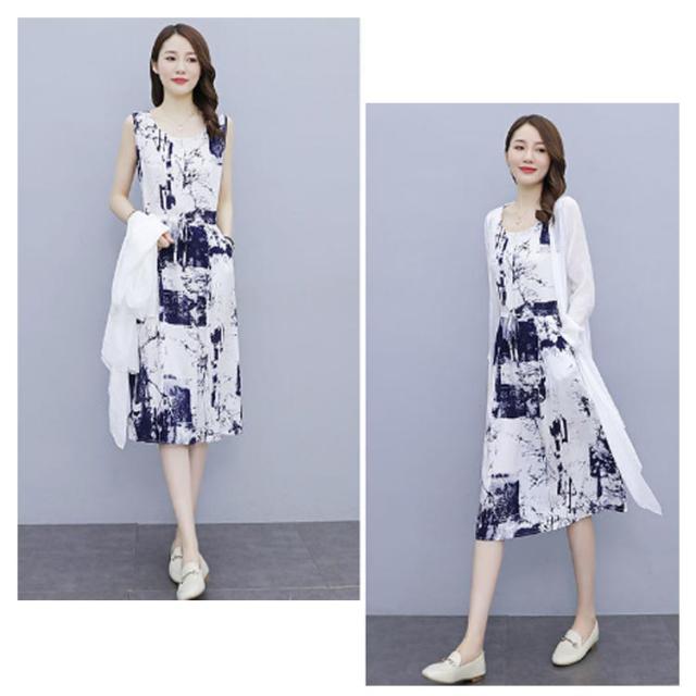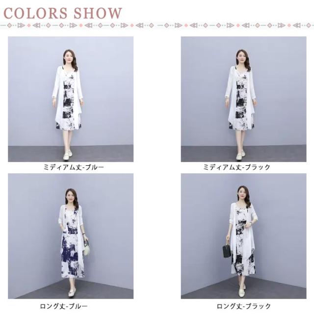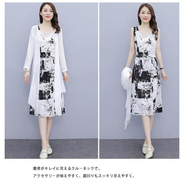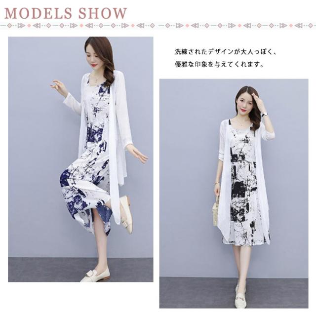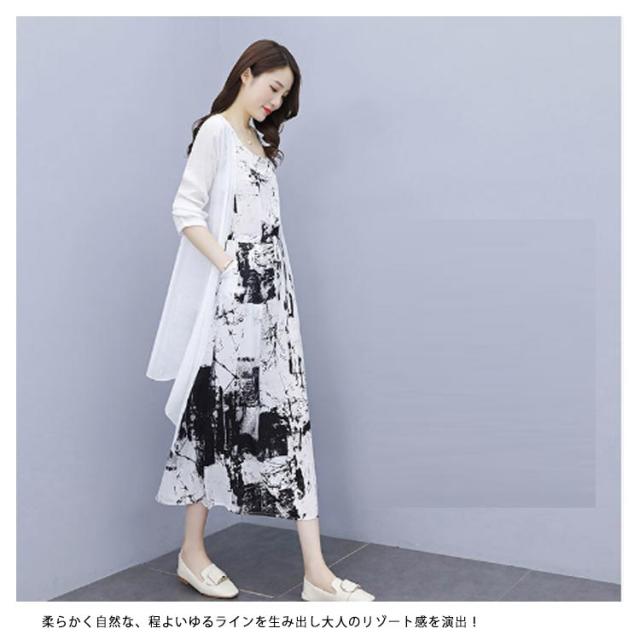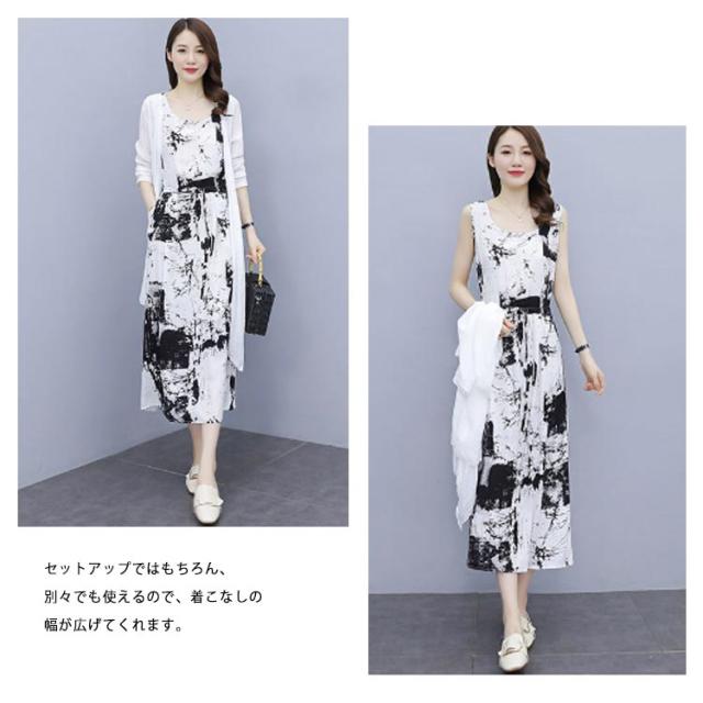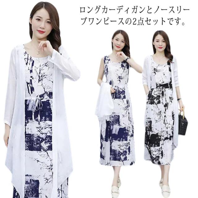 ワンピース レディース ノースリーブ 2点セット ロングカーディガン プリント ゆったり マキシ丈 袖なしワンピース 重ね着 春夏 大きいサイズ 通勤 お洒落