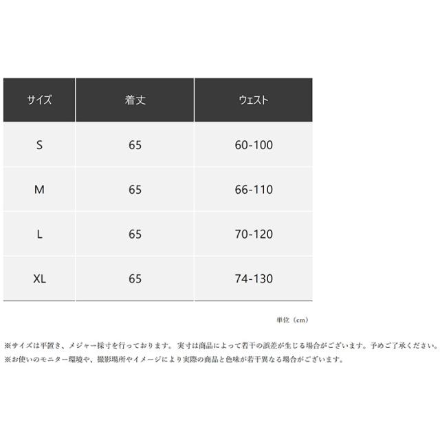 | サイズについての説明 | 【S】着丈65cm ウェスト60-100cm 【M】着丈65cm ウェスト66-110cm 【L】着丈65cm ウェスト70-120cm 【XL】着丈65cm ウェスト74-130cm |