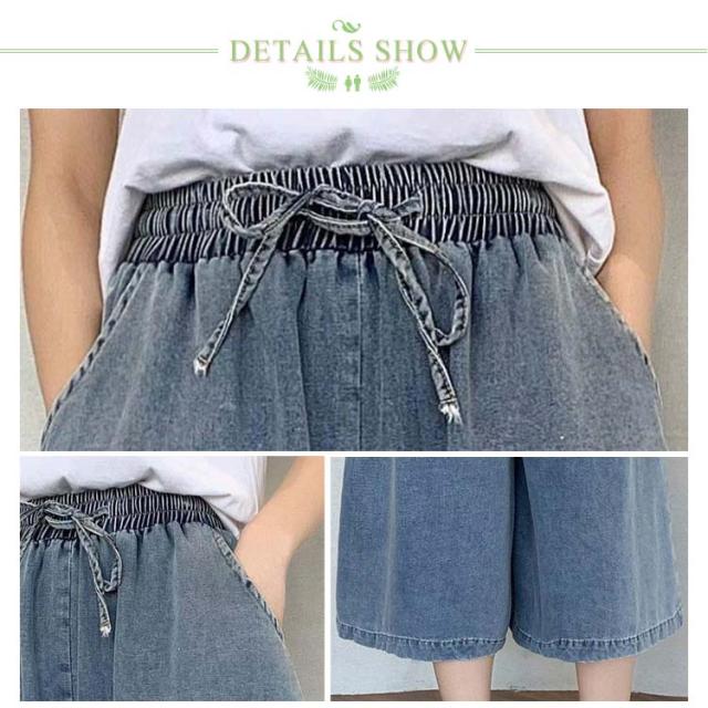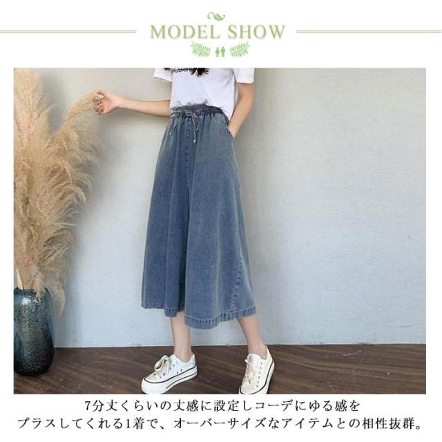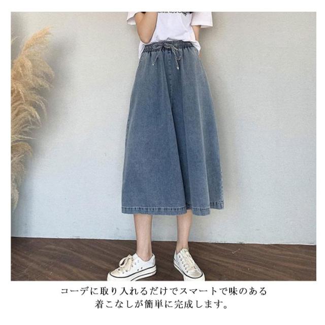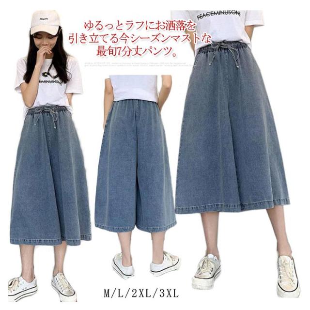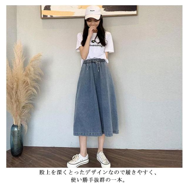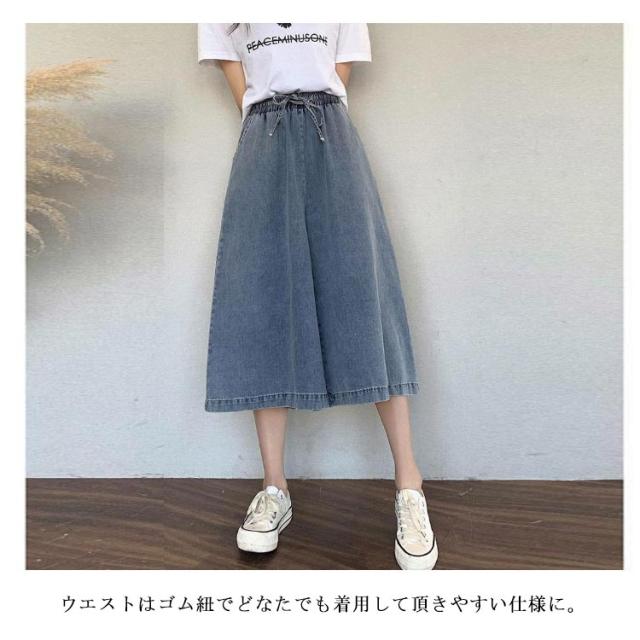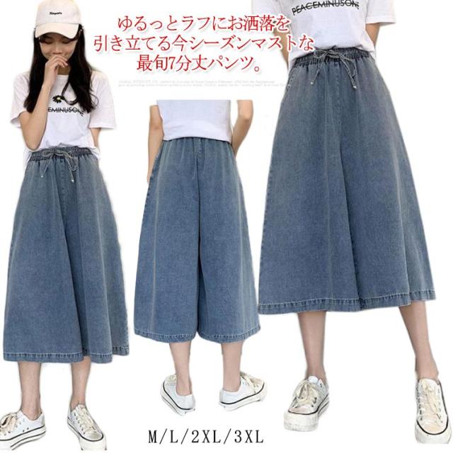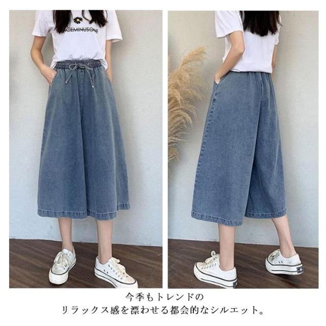 体型カバー ワイド 【送料無料】デニムパンツ ゆったり 7分丈 通勤 薄手 デニムワイドパンツ リボン 大人 ゴムウエスト 通学 ハーフパンツ カジュアル リボン 可愛い 20代 30代 40代 50代 ボトムス