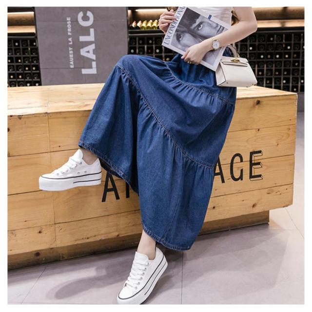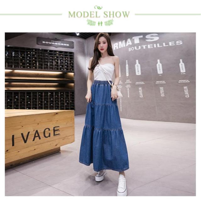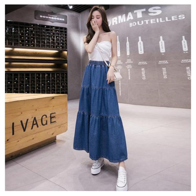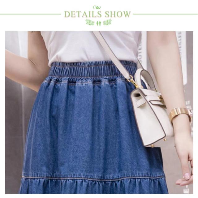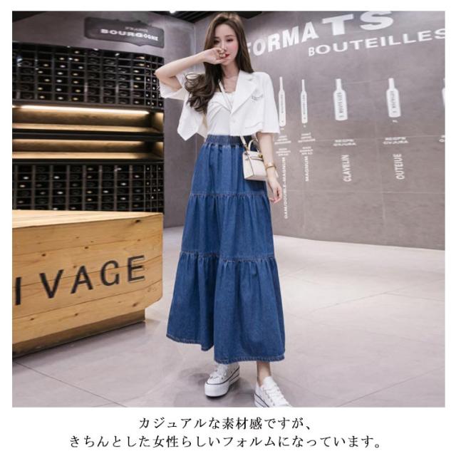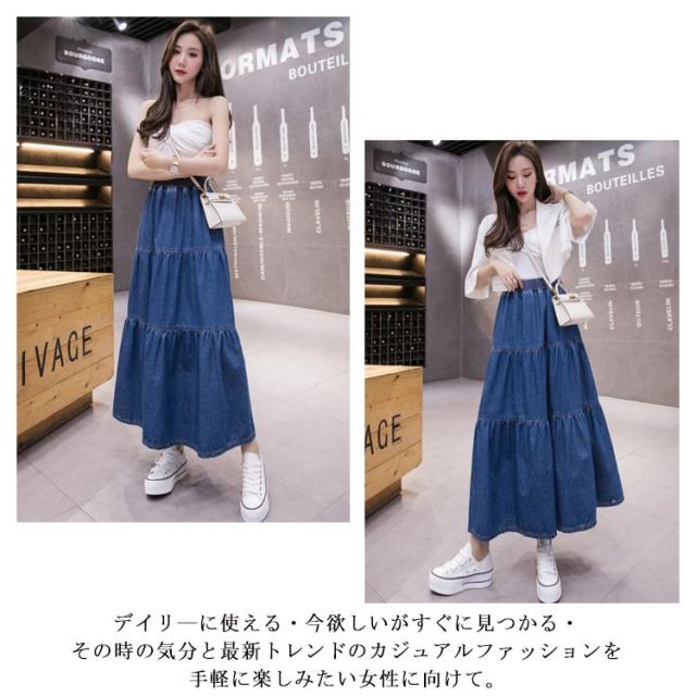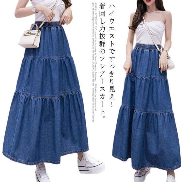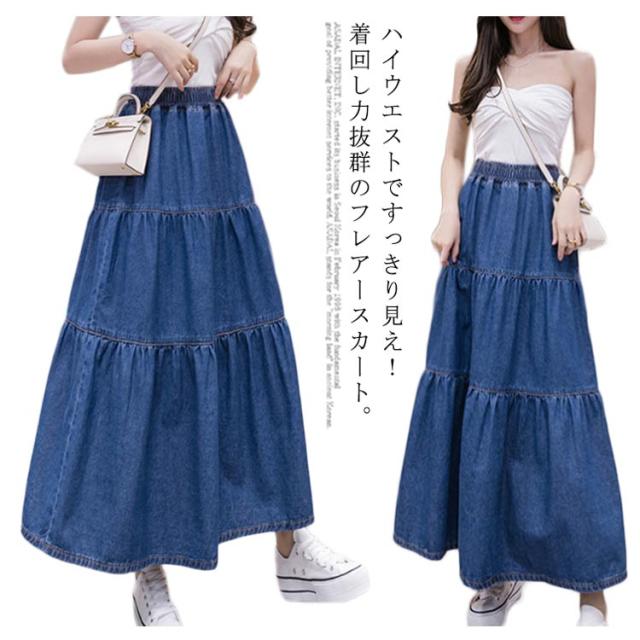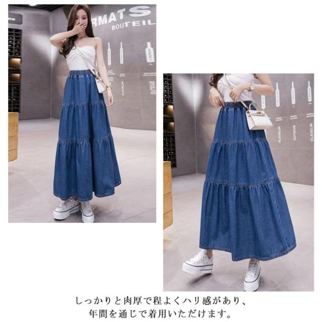 ハイウエスト タック入り Aライン ロング ゆったり きれいめ レディース 【送料無料】デニムスカート ミモレ丈 体型カバー 大人 カジュアル ティアード 薄手 膝下 ブルー おしゃれ ゴムウエスト
