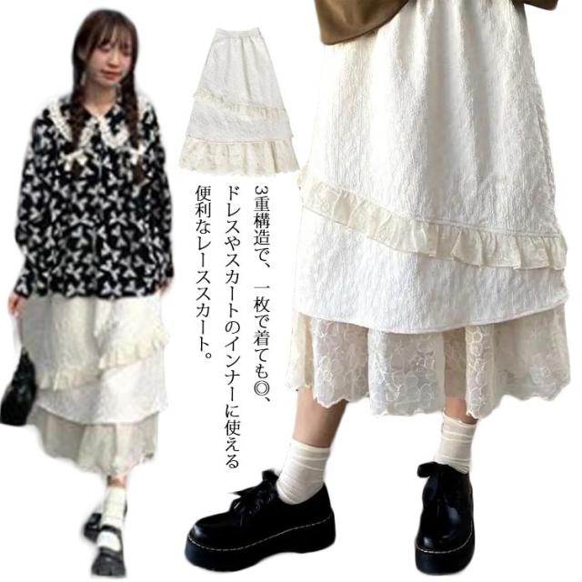 ペチスカート ロング丈 春夏 インナー 見せ 裾 ナチュラル レース 【送料無料】スカート 刺? ペチコート 女の子 ガーリー 白 ゆったり 重ね着 メロウ 20代 30代 40代 50代 裏地付き 大人
