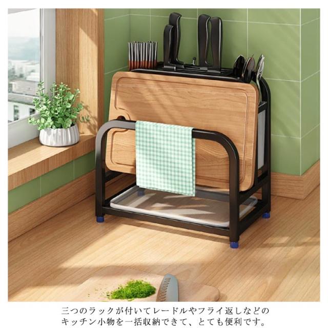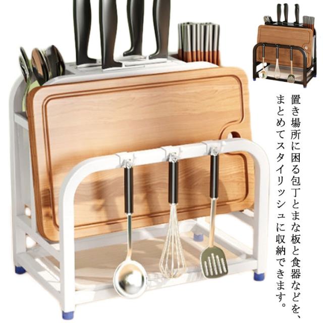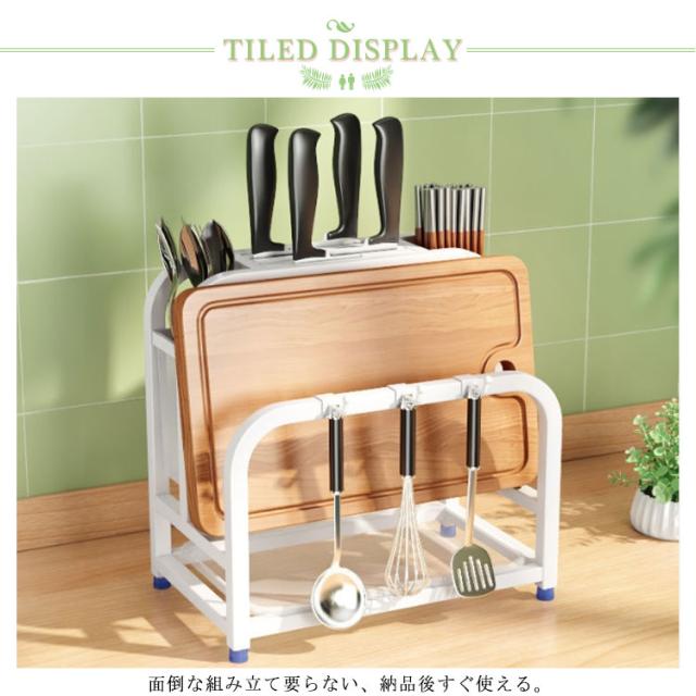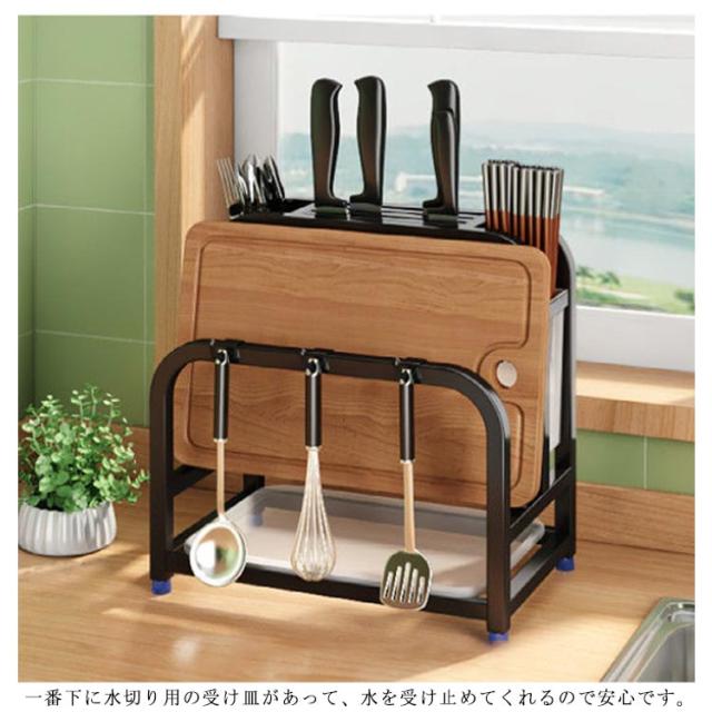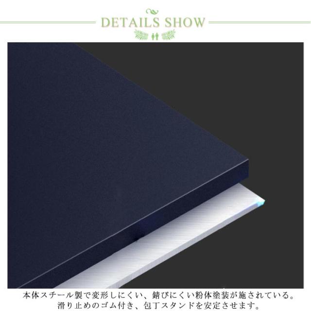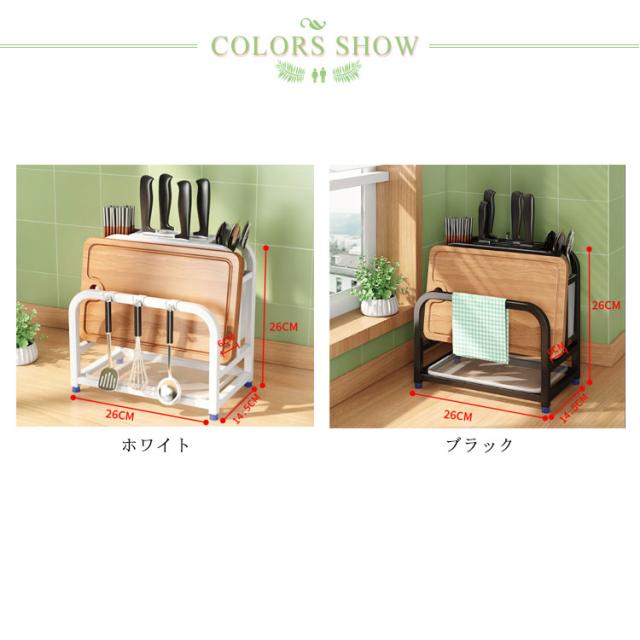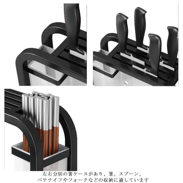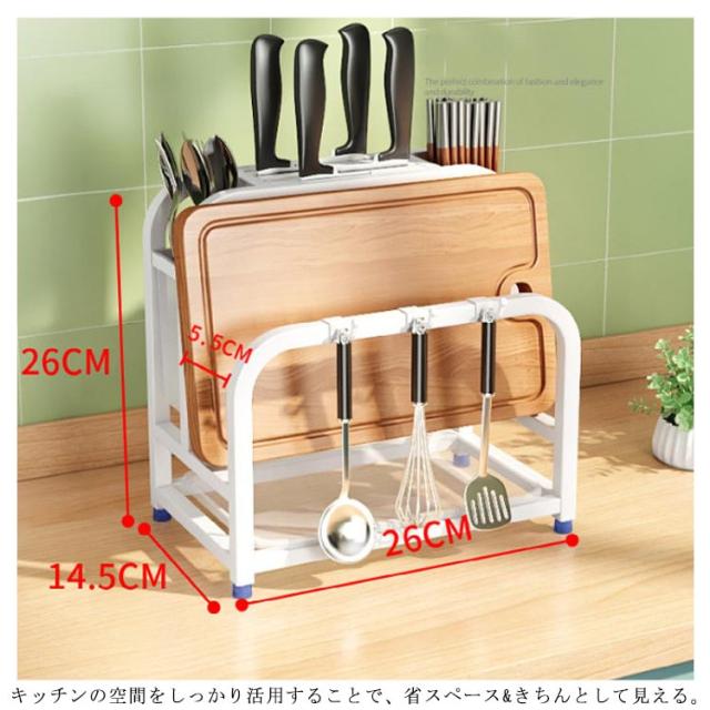 | 置き場所に困る包丁とまな板と食器などを、まとめてスタイリッシュに収納できます。 面倒な組み立て要らない、納品後すぐ使える。 本体スチール製で変形しにくい、錆びにくい粉体塗装が施されている。滑り止めのゴム付き、包丁スタンドを安定させます。 左右分別の箸ケースがあり、箸、スプーン、ペテナイフやフォークなどの収納に適しています 三つのラックが付いてレードルやフライ返しなどのキッチン小物を一括収納できて、とても便利です。 一番下に水切り用の受け皿があって、水を受け止めてくれるので安心です。 キッチンの空間をしっかり活用することで、省スペース&きちんとして見える。 | |