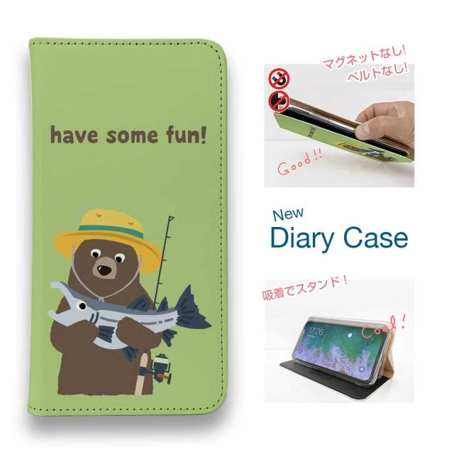 スマホケース 手帳型 ベルトなし iPhone17 Pro Max iPhone Air iPhone16e Pro Max 16 Plus 15 Pro Max 14 Plus Xperia 10 VII Galaxy AQUOS Pixel10 Pro XL 釣り 魚 ルアー 釣りざんまい クマさんサケ釣りを楽しむ