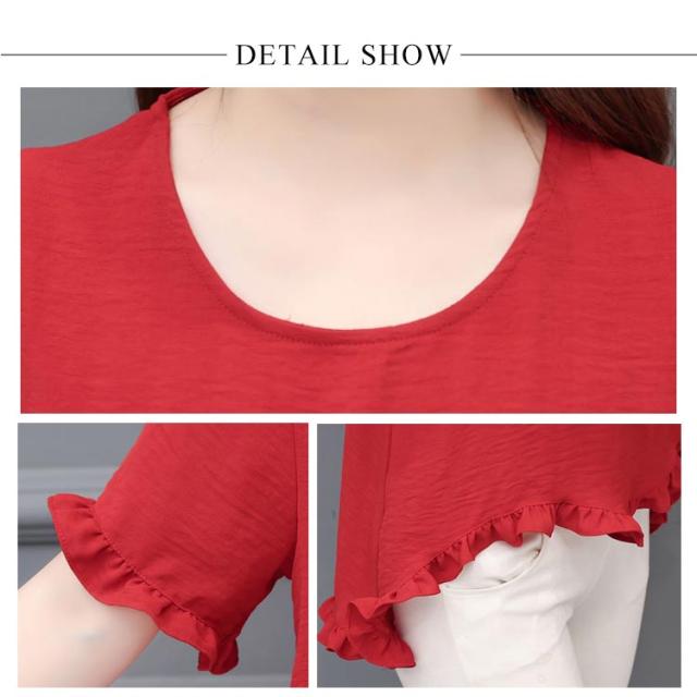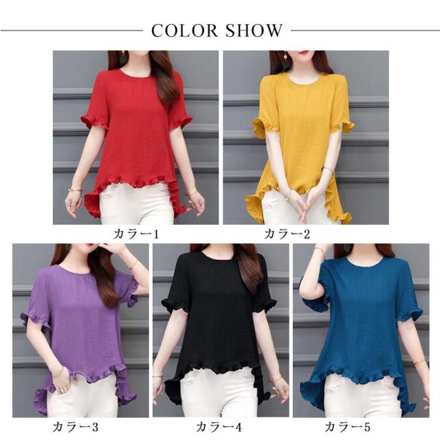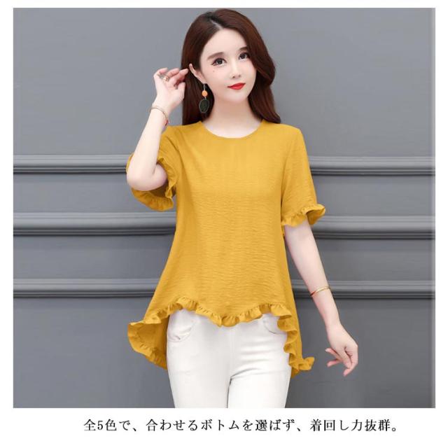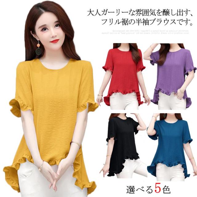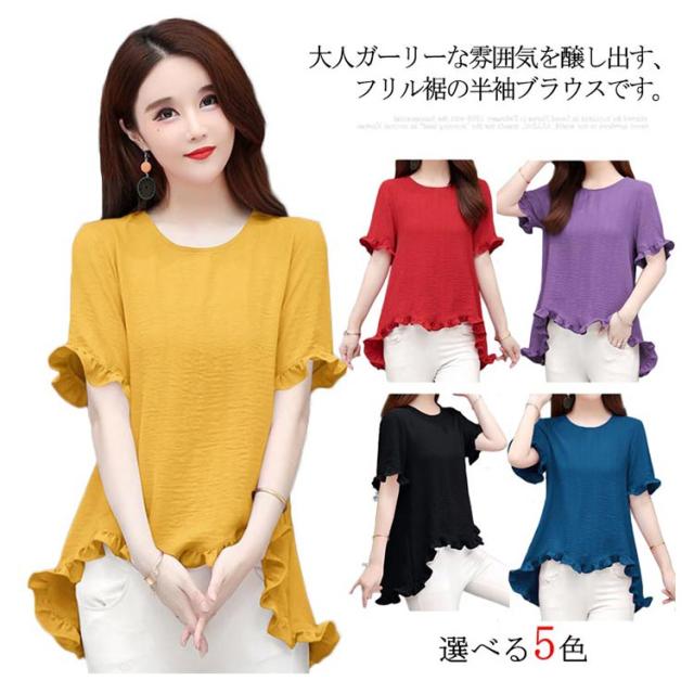 テールカット ブラウス シャツ シフォントップス 半袖シャツ 春夏 おしゃれ 体型カバー ガーリー 大きいサイズ ゆったり お尻 隠し 裾フリル 上品 L-5XL 送料無料