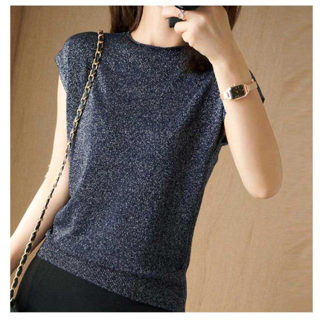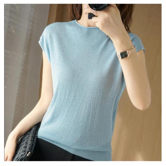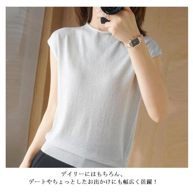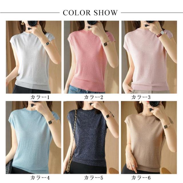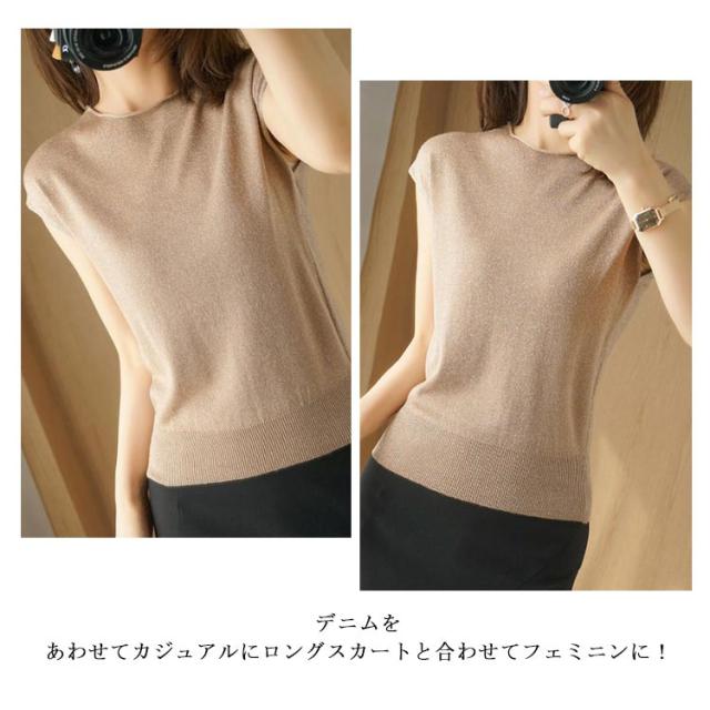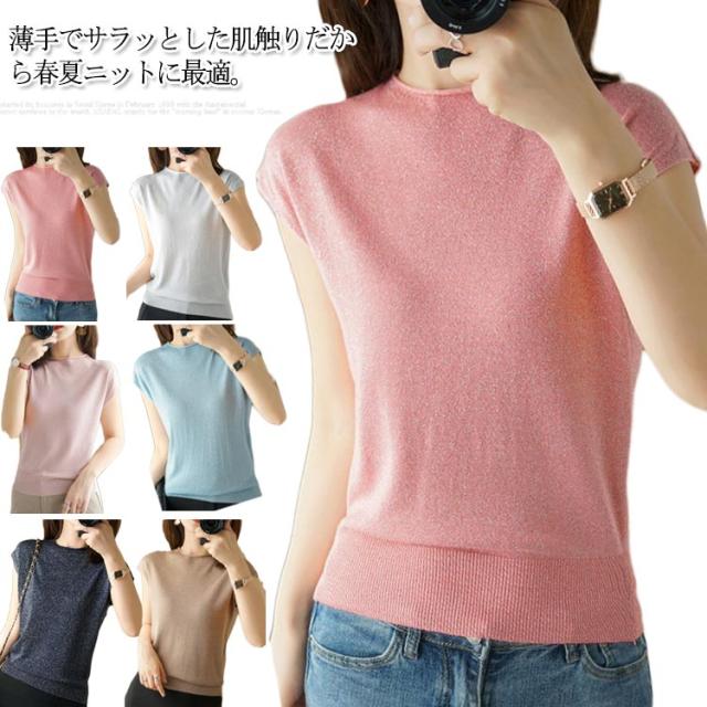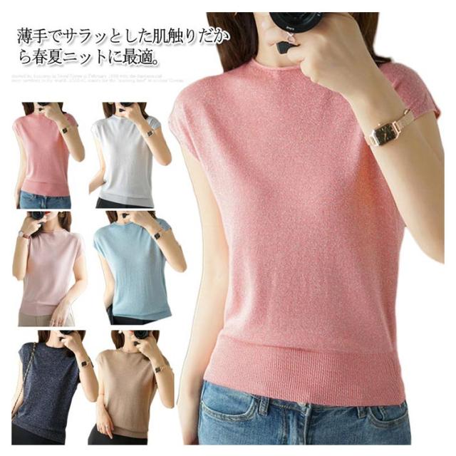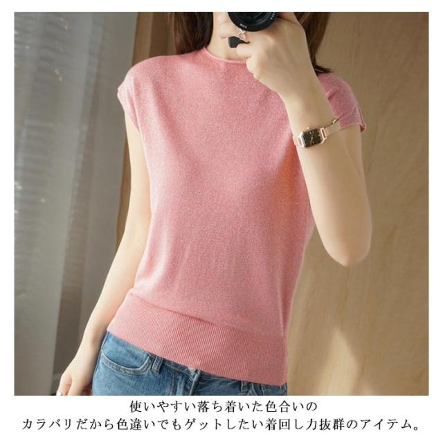 サマーニット フレンチスリーブ タートルネック カットソー レディース トップス Tシャツ ニットトップス レイヤード ラメ入り 接触冷感 着?せ フェミニン オフィス 春夏 S M L XL 2XL