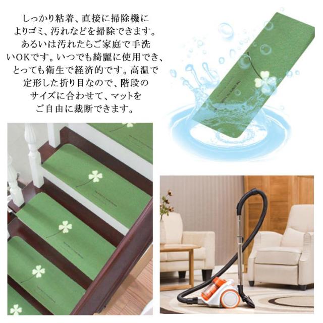 | 【簡単吸着】裏面の保護膜を剥いて階段に簡単にしっかり吸着して、掃除機をかけてもずれず、剥がしても跡が残らないから貼り直しも簡単にできます。裏面の粘着力が半永久的に持続するので繰り返す使用ができ、とても経済的です。 【優れた吸音性】表面は柔らかいポリエステル繊維、踏み心地が優しいです。裏面はざらざらとしたPVC、板にしっかり密着できます。ポリエステル素材は吸音性が優れるため、いつも気になる足音を軽減できます。階段の上り下りの騒音対策や衝撃も緩和され足腰にも優しいです。落ち着く雰囲気を醸し出すために新築やマンションにも最適です。 【転倒防止】滑り止めが加工され、階段での危険な転倒の防止対策にぴったりです。小さなお子様はもちろん年配の方やペットにもこれで安心です。ペットの爪キズ防止に最適です。また床キズの防止にもなるので新築や賃貸住宅にも優しいです! 【蛍光設計】蛍光材質ですので、電気消してもしばらく見えますので安心!吸収する光が強ければ強いほど、より明るく、長時間発光を続け、弱ければ発光も暗く、 時間も短くなります 【清潔簡単&自由にカット】しっかり粘着、直接に掃除機によりゴミ、汚れなどを掃除できます。あるいは汚れたらご家庭で手洗いOKです。いつでも綺麗に使用でき、とっても衛生で経済的です。高温で定形した折り目なので、階段のサイズに合わせて、マットをご自由に裁断できます。 | |