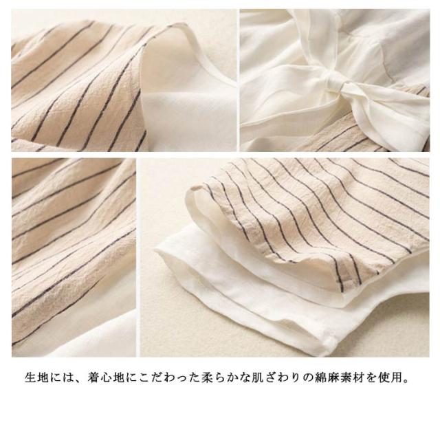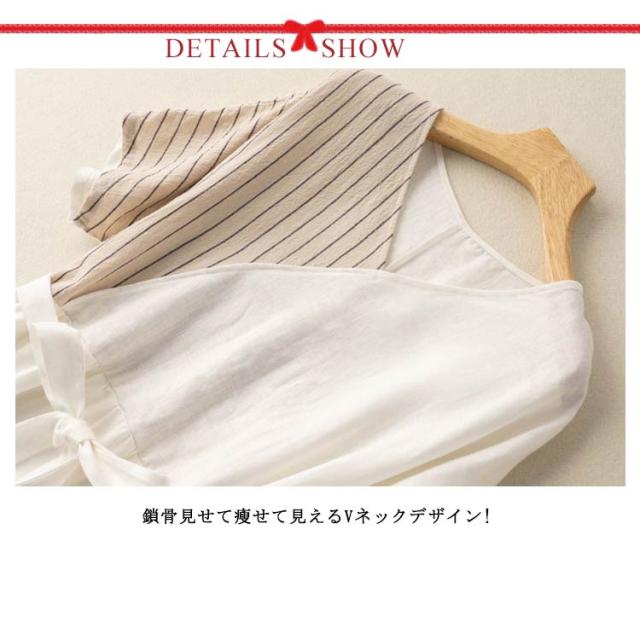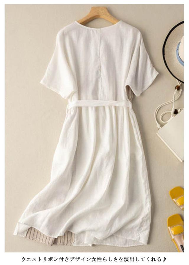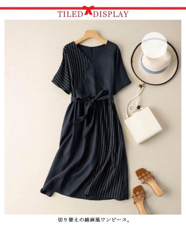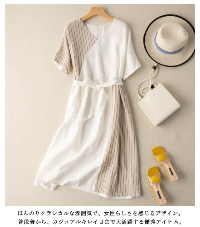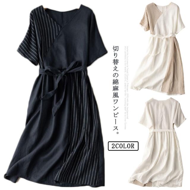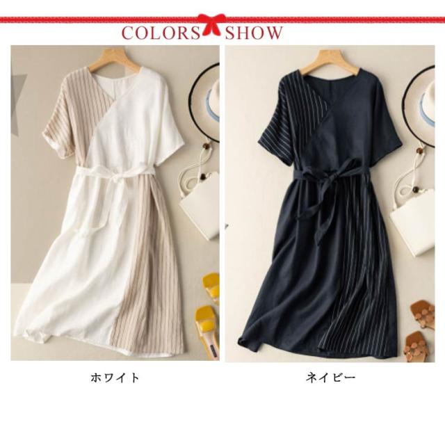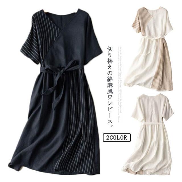 シンプル レディース リネンワンピース マキシ vネック 麻ワンピ リネンワンピース 涼しい ロング 半袖 ワンピ Aライン ナチュラル きれいめ カジュアル 体型カバー 春 通勤 通学 夏 ストライプ柄 切り替え