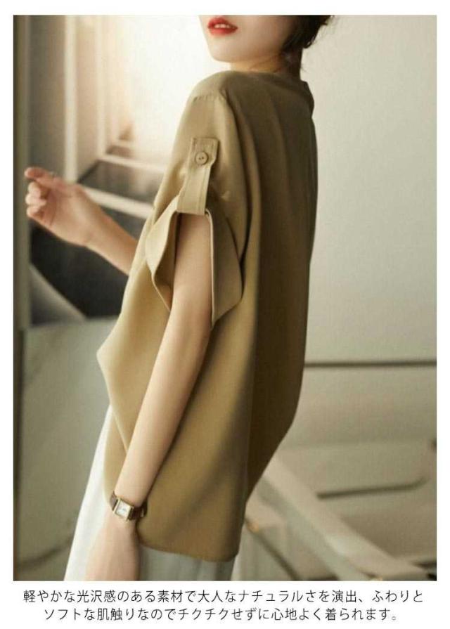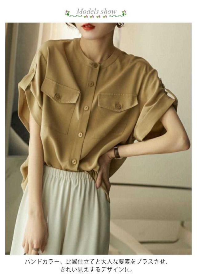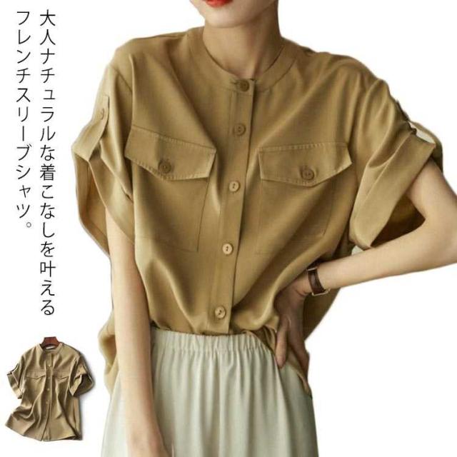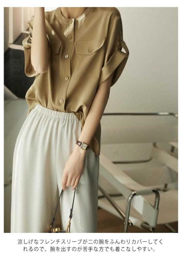 フレンチスリーブ トップス 半袖 半袖 シャツ レディース カジュアル ロールアップ フレンチスリーブ スタンド衿 ブラウス 羽織り ポケット付き 前開き ゆったり 美シルエット 光沢 サラサラ 体型カバー