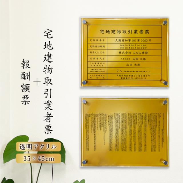 【アルミ複合板×透明アクリル 黄金色】宅地建物取引業者票(令和7年4月1日施行版)+報酬額票(令和6年7月1日施行版) 2点セット H35×W45cm tk-com-acryl01g-2set