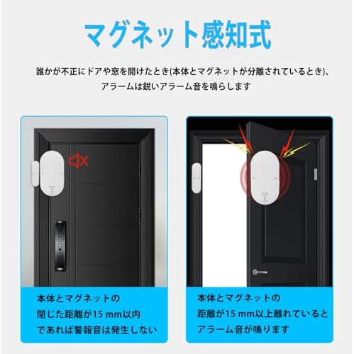 【不審者を防ぐ誤操作を防ぐ】本防犯アラームの検知方式はマグネット感知式です。このマグネット感知式が振動センサー、人体センサーと異なる点は、本体とマグネットが15mm 以上離れると、アラーム音が鳴ります。つまり、不審者がドアや窓からお客様の家に侵入しようとすると、防犯ブザーが鳴って警告します。また、この検知方式は誤操作を効果的に防止することができます。
