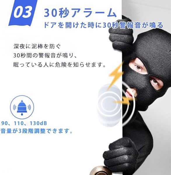 【3段階音量を調整可能】お客様の音量の違いに対するニーズに対応するために、本防犯アラームは音量を調整できる機能を持っています。お客様は自分のニーズに合わせて、90dB、110dB、130dBの3種類の音量の中から1つを選ぶことができます。音量が大きすぎて近所に迷惑をかける心配もありませんし、音量が小さすぎて防犯効果がないという心配もありません。