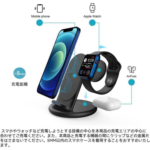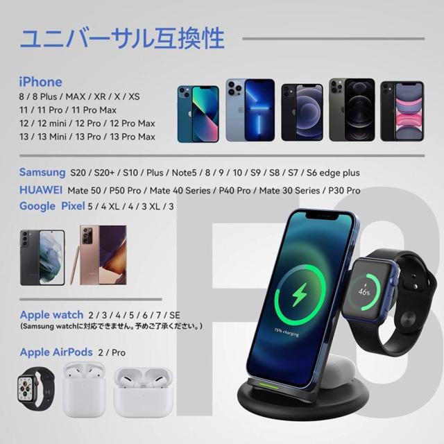 【多機能3 in 1ワイヤレス充電器】本商品は、Qiと互換性がある携帯電話とWatch とイヤホンを同時に充電できます。Iphone:iphone 8 /8 Plus/MAX / XR / X / XS/11/11 Pro / 11 Pro Max/12/12 mini / 12 Pro / 12 Pro Max/13/13 Mini / 13 Pro / 13 Pro Max;(iphone SE に対応できません)Samsung:S20 / S20 + / S10 / Plus / Note5 /8/9/10 / S9 / S8 / S7 / S6 edge plus;HUAWEI:Mate 50/P50 Pro/Mate 40 Series/ P40 Pro/Mate 30 Series/P30 Pro;Google : Pixel 5/4 XL/4/3 XL/3など多くのQi認定携帯電話と互換性があります。ご購入前は、お持ちになる機種はワイヤレス充電機能に対応かどうかをご確認の程よろしくお願い申し上げます。