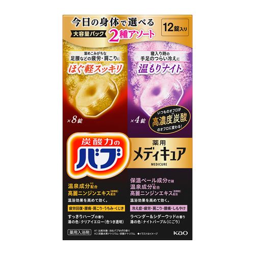 | 商品説明 | ほぐ軽スッキリ:立ち仕事や運動による足腰などのつらい疲労に。疲労回復・腰痛に効く! 温もりナイト:寝入り時の手足のつらい冷えに効く!保温ベール成分(芒硝)配合 ■アソート2種共通:●高濃度※1炭酸●温泉成分※2配合 ●高麗ニンジンエキス(湿潤剤)配合●ビッグサイズ※1でパワフル発泡●泡の数バブ10倍※1のここちよさ ※1比較対象:花王バブゆずの香り※2炭酸水素ナトリウム・炭酸ナトリウム【医薬部外品】 |