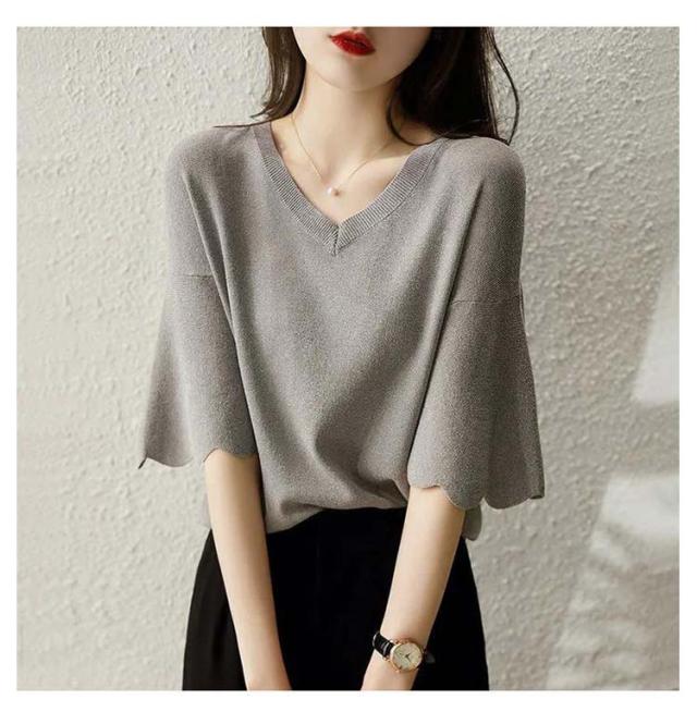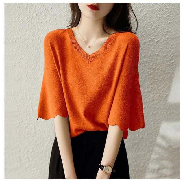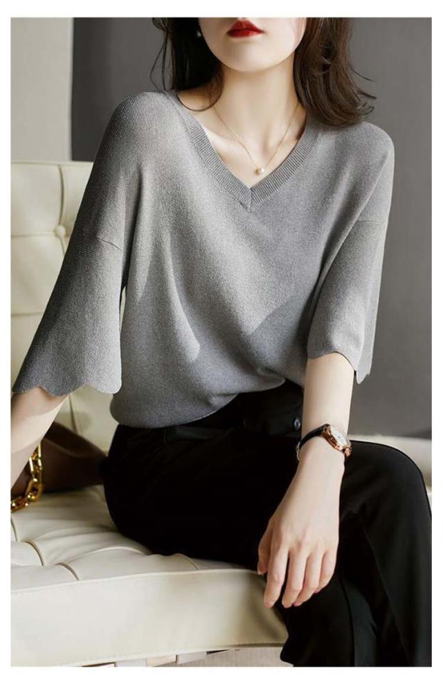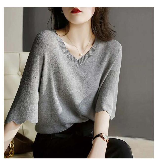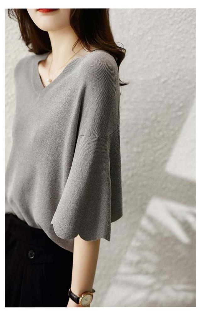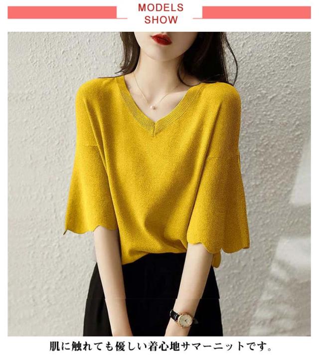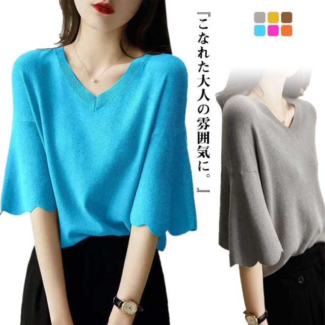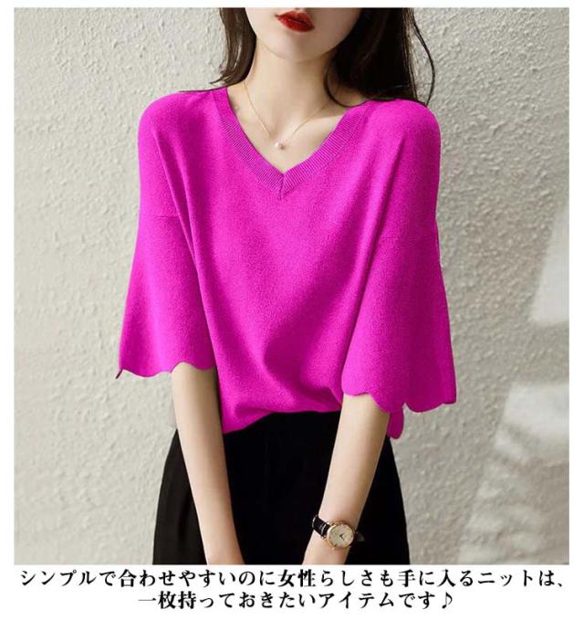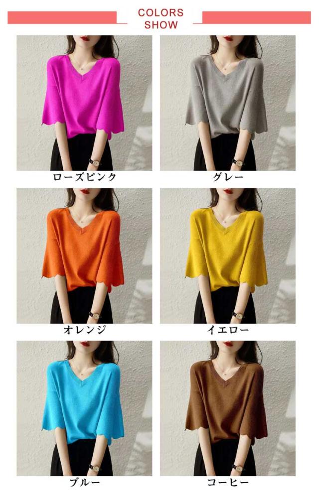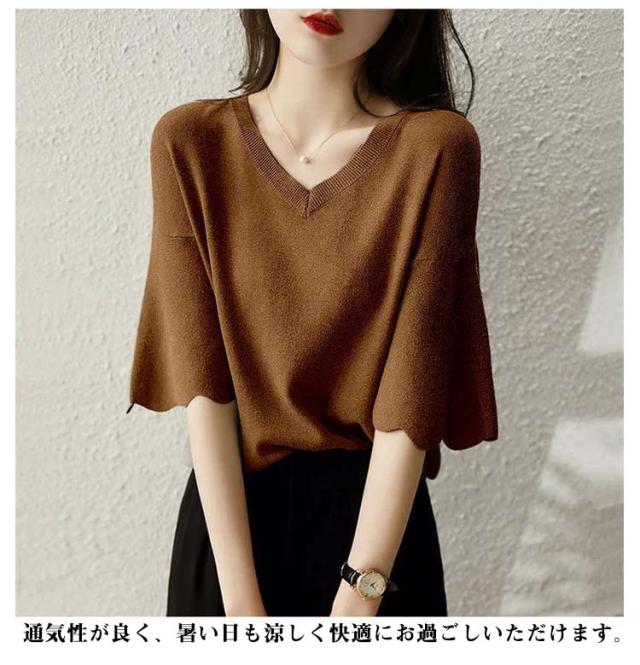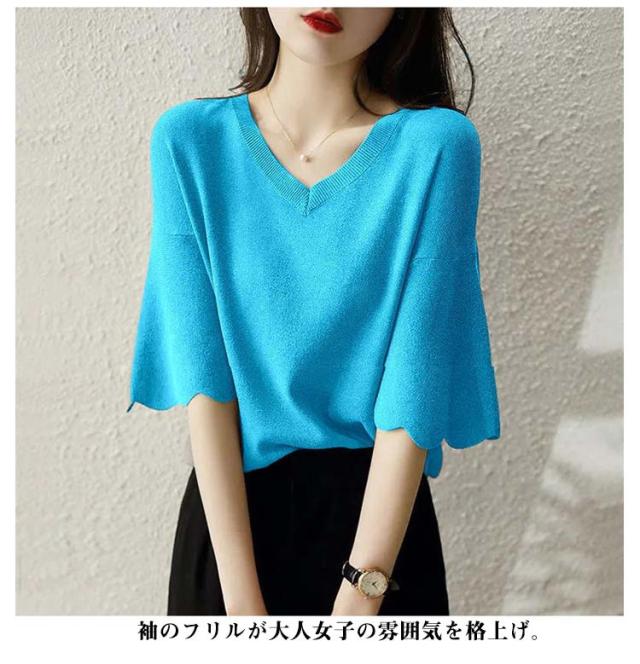 レディース フリル サマーセーター 無地 七分袖フリルニット トップス プルオーバー Vネック サマーニット 七分袖 五分袖 春夏