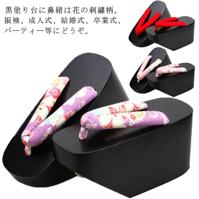 刺繍 厚底ヒール下駄 鼻緒 レディース 黒台 ぽっくり下駄 振袖 成人式用 振袖用 浴衣用 女性用