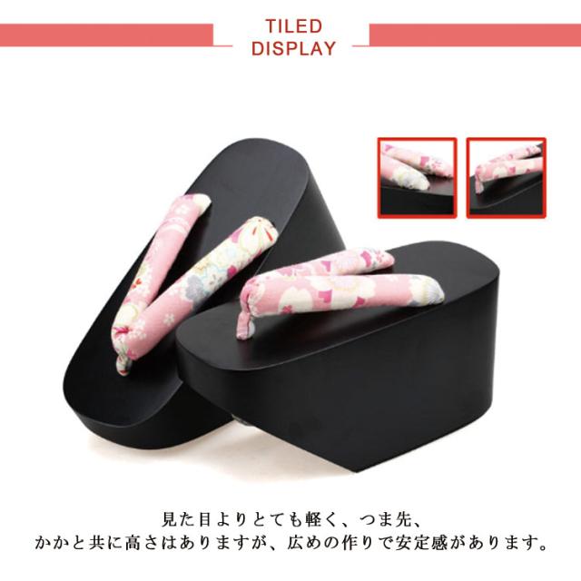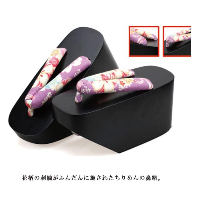 | 黒塗り台に鼻緒は花の刺繍柄。 振袖、成人式、結婚式、卒業式、パーティー等にどうぞ。 見た目よりとても軽く、つま先、かかと共に高さはありますが、広めの作りで安定感があります。 花柄の刺繍がふんだんに施されたちりめんの鼻緒。 幅広で厚みがあり、裏には柔らかな生地を使用して足が痛くなりにくい工夫もされております。 耐久性を持たせ、より長く履いて頂けるよう天然ゴムと耐摩耗性、底ゴムを下駄の底ゴムに採用致しました。 ※天然素材の桐を使用し、艶のある塗料で仕上げております関係上、色ムラや多少の傷がございます。 | |