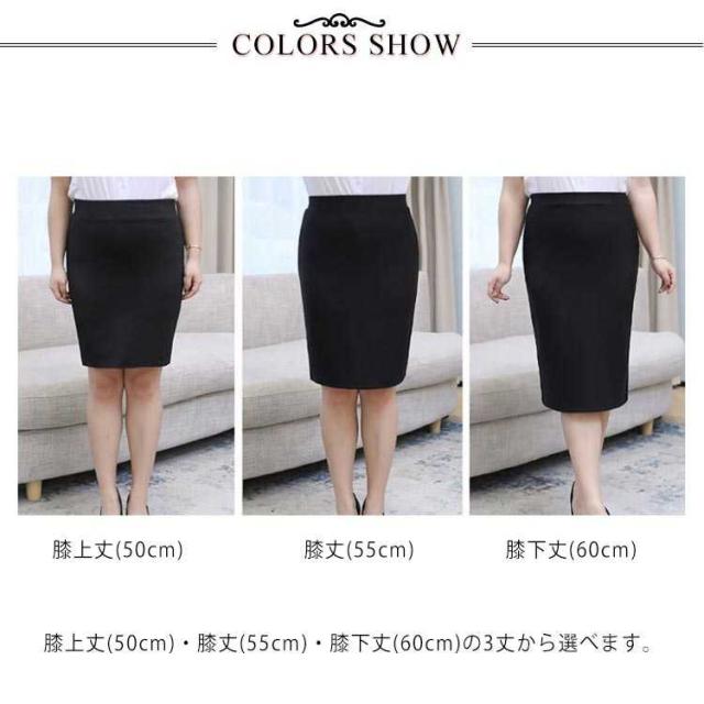| ぽっちゃり体型の女性におすすめのタイトスカート。 ストレッチ素材を使用していて動きやすいのも魅力です。 防シワ加工も施されている上、自宅での洗濯・お手入れも可能です! 裏地付きで安心してご着用いただけます。 膝上丈(50cm)・膝丈(55cm)・膝下丈(60cm)の3丈から選べます。 シンプルな黒無地で、就職活動や転職活動、通勤などにおすすめ! | |
