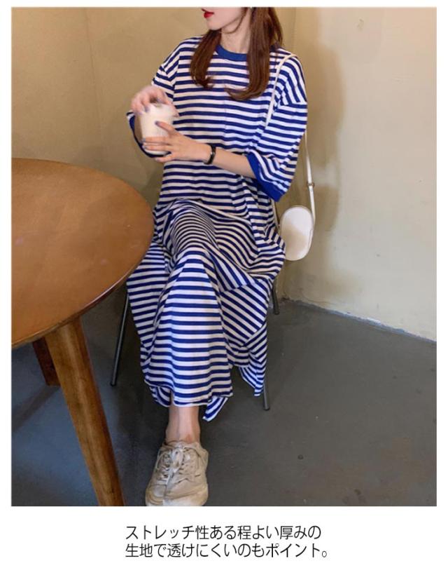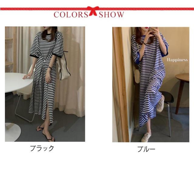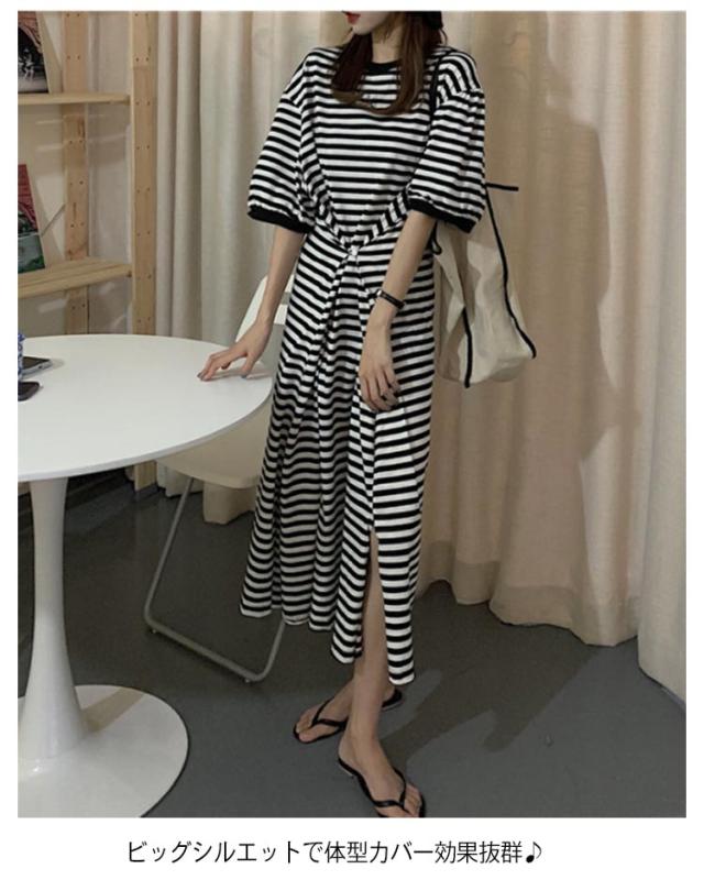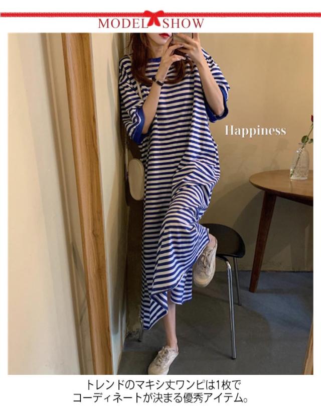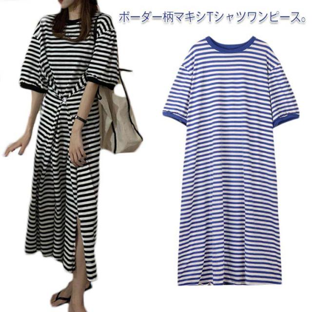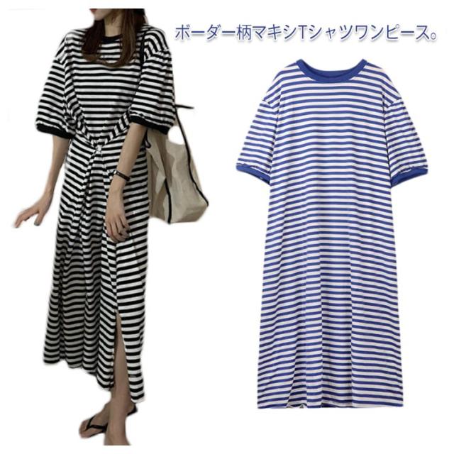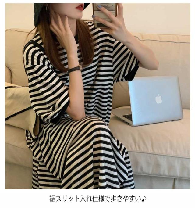 マキシワンピース Tシャツワンピース 半袖 ロングワンピース ロング レディース ワンピ ボーダー柄 大きいサイズ 春夏 ゆったり 体型カバー 着痩せ スリット 五分袖