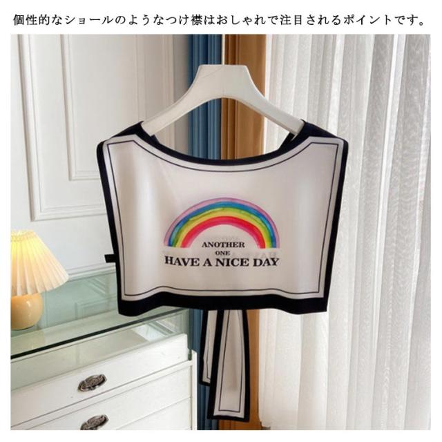 | 個性的なショールのようなつけ襟はおしゃれで注目されるポイントです。 単調なTシャツやセーターと合わせておしゃれになります。 飾りで甘い印象を与え、日常の着こなしに可愛さを添えます。 重ね着のもたつきがなくオシャレが楽しめます。 夏はTシャツやタンクトップ、キャミソールなどのノースリーブのトップスと合わせます。 | |