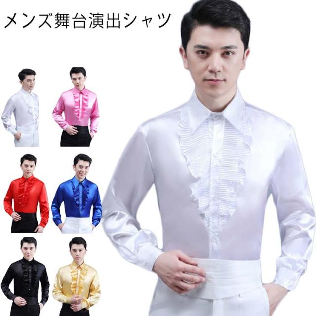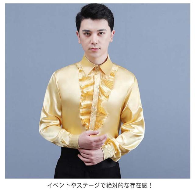 サテンシャツ フリルシャツ 長袖 ステージ ダンス衣装 派手 カラバリシャツ メンズシャツ スタンドカラー おしゃれ 忘年会 ダンス衣装 舞台衣装 フリル 新年会 余興 団体服 写真撮影 礼服 司会者