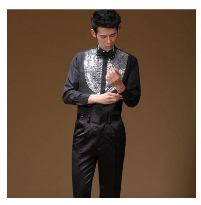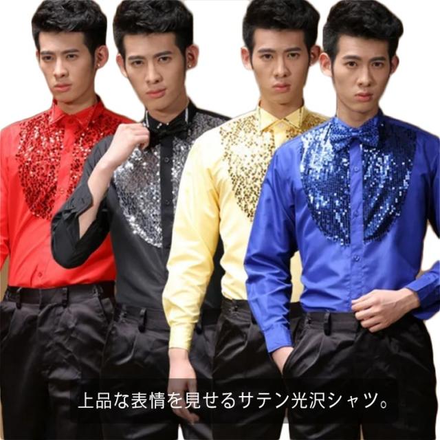 社交ダンス 蝶ネクタイ付き 衣装 長袖 スパンコール カラバリシャツ ステージ衣装 パーティー サテンシャツ ダンス ダンス衣装 シャツ 舞台衣装 光沢 司会者 礼服 メンズ