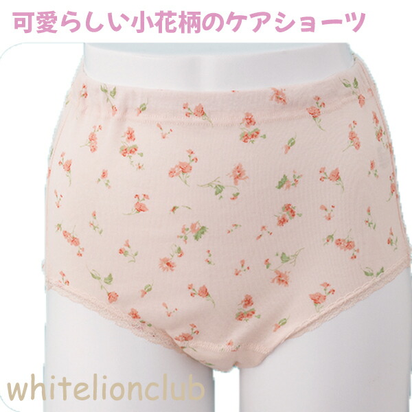 丈長タイプではきやすい、かわいらしい小花柄のケアショーツ。