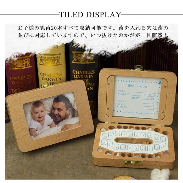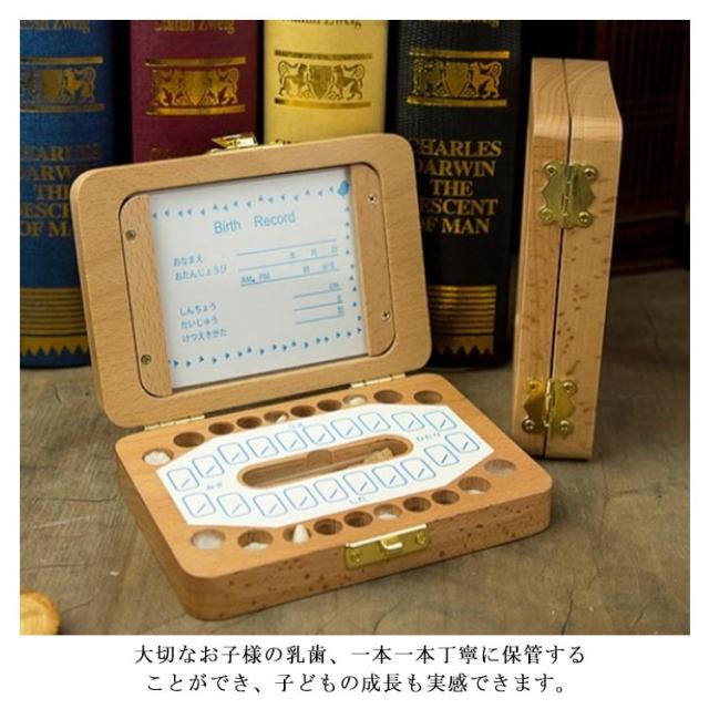 | 大切なお子様の抜けた歯を記念に取っておける乳歯ケースです! 【オススメのポイント】 お子様の乳歯20本すべて収納可能です。歯を入れる穴は歯の並びに対応していますので、いつ抜けたのかがが一目瞭然! 大切なお子様の乳歯、一本一本丁寧に保管することができ、子どもの成長も実感できます。 手作りの木製品で、精密でありながら耐久性もあります。 良質な金具と留め具付き、乳歯ケースのカバーをしっかり固定し、機能的で、錆びにくいです。 湿気に強い、通気性の良い素材を採用し、長時間保存できます。 小さい乳歯の出し入れ便利なピンセット付きです。 【乳歯保存の手順】 1. 抜け落ちた乳歯をお湯に5分間くらい置く。 2. 自然に乾燥させる。 3. 対応する穴に綿を付けて、歯を入れる。 【 セット内容 】 ・本体 ・ピンセット ・脱脂綿 ・記録シール ・オリジナルBOX | |