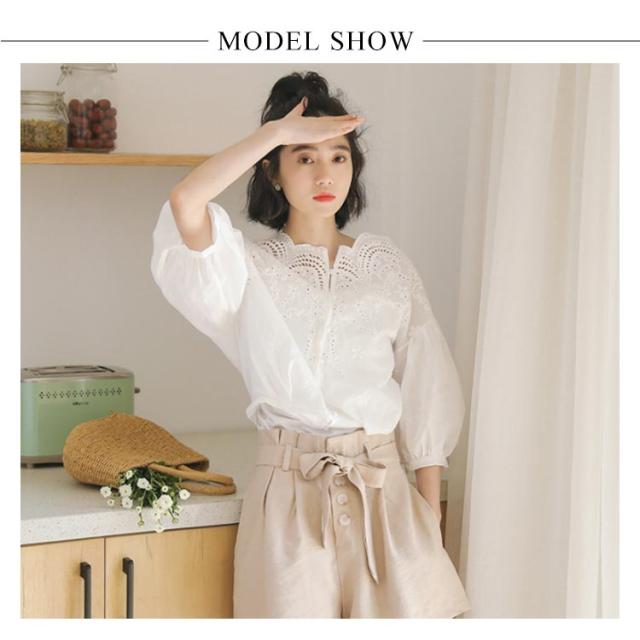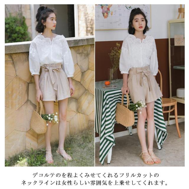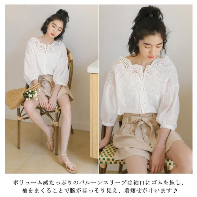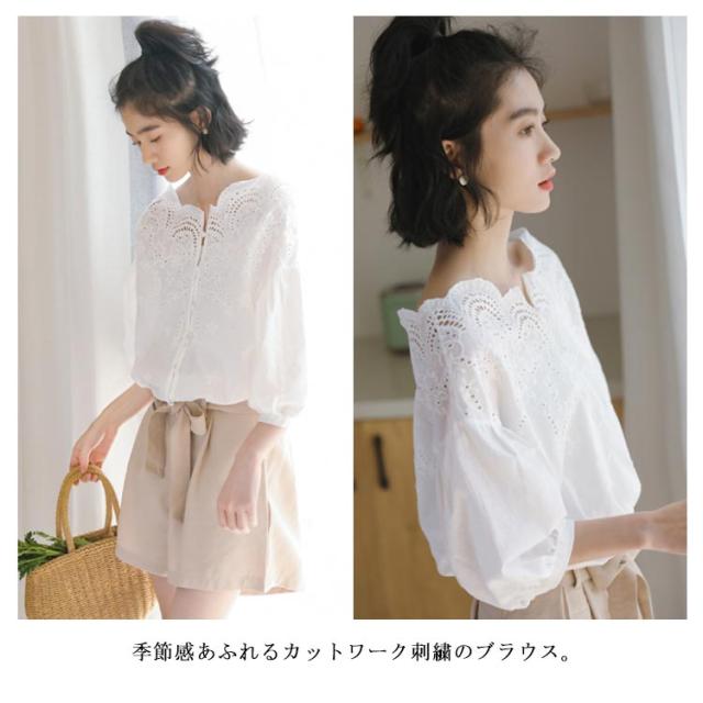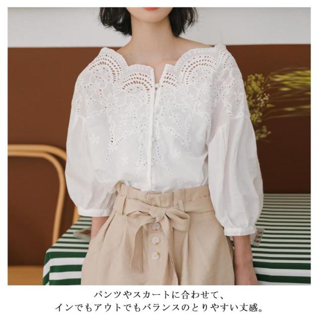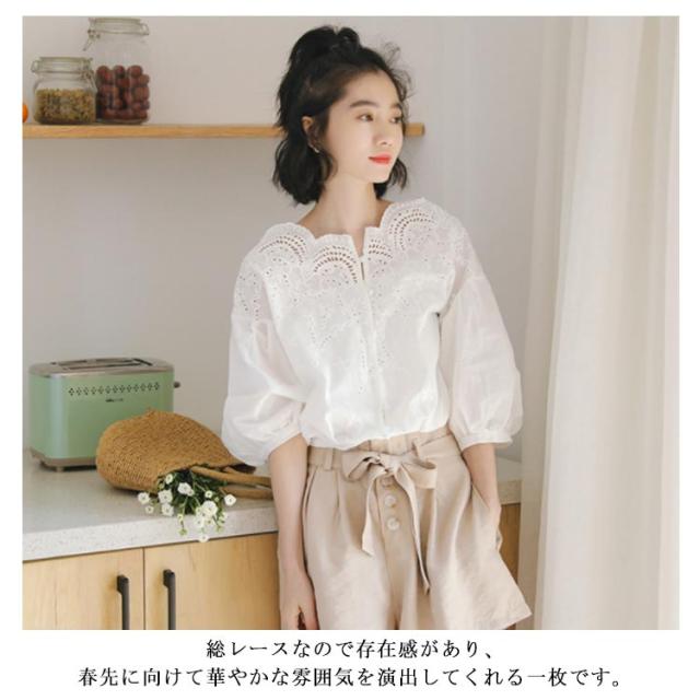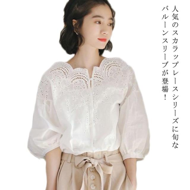 スカラップ レースブラウス コットンレース ブラウス レース 送料無料 刺繍 シャツ レディース バルーンスリーブ トップス 透け感 ゆったり 大人可愛い きれいめ カジュアル 春夏秋 白 ホワイト